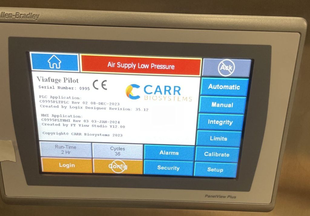 Equipped with a powerful 2 HP motor, the Carr ViaFuge Pilot clarifier centrifuge operates on a standard 115V single-phase power supply, drawing 13.9A. The NEMA 4X control panel provides a user-friendly interface for monitoring and controlling the centrifuge operations, ensuring safety and compliance with industrial standards. Additionally, the jacket is rated for full vacuum and can withstand pressures up to 100 PSI, with a temperature range from -20 to 300 degrees Fahrenheit. This feature is particularly beneficial for applications requiring precise temperature control during the separation process. The centrifuge comes with spare parts and manuals, ensuring that maintenance and operational guidance are readily available, which is crucial for minimizing downtime and enhancing productivity.