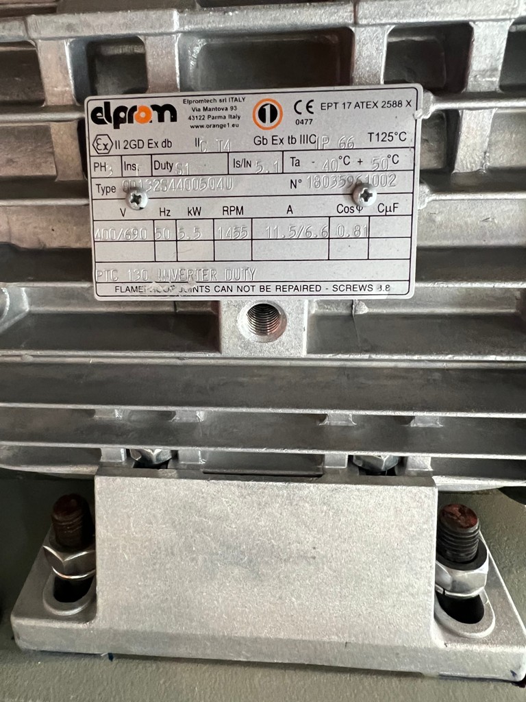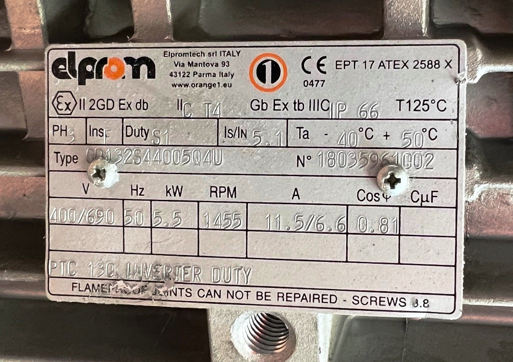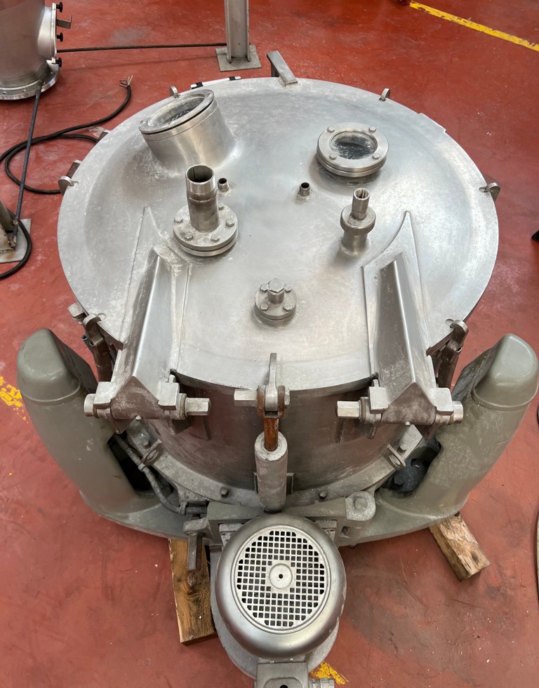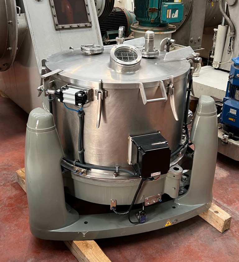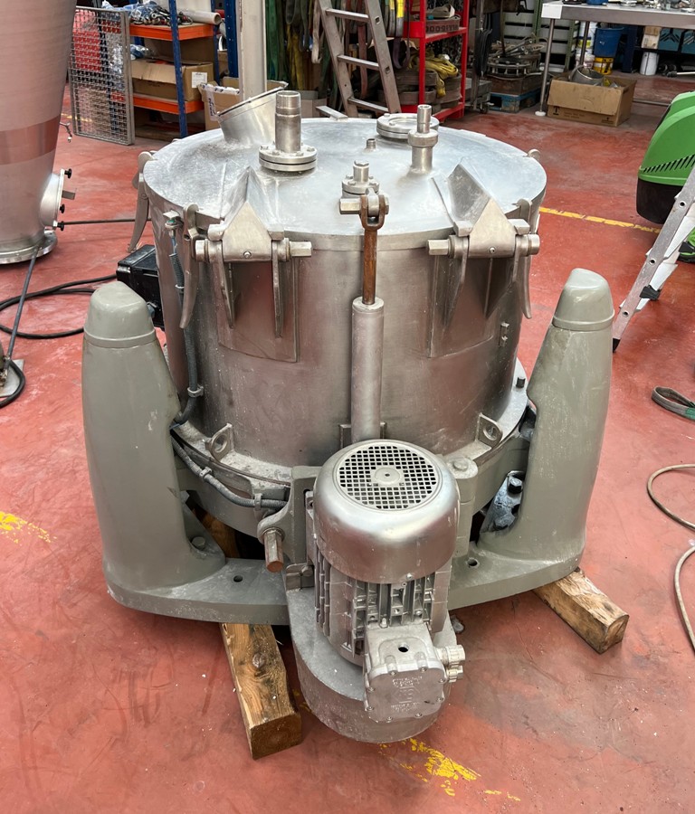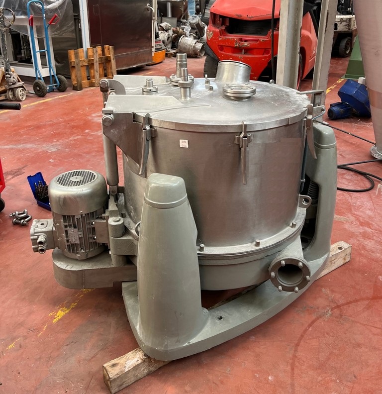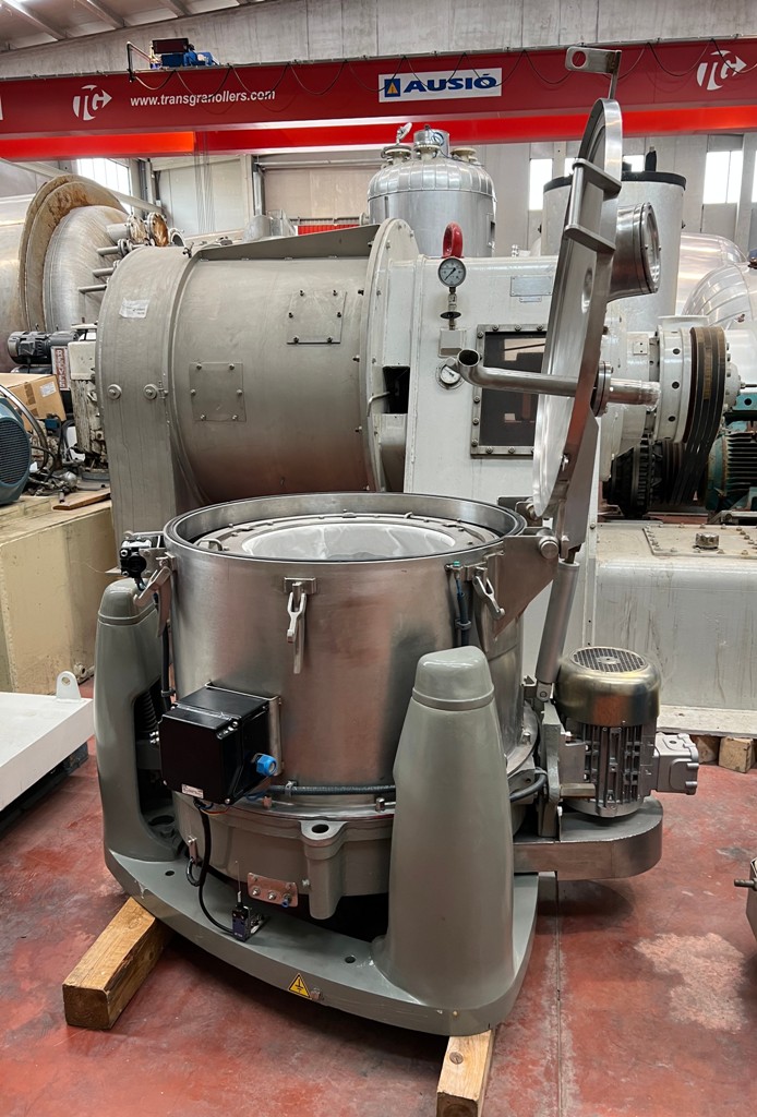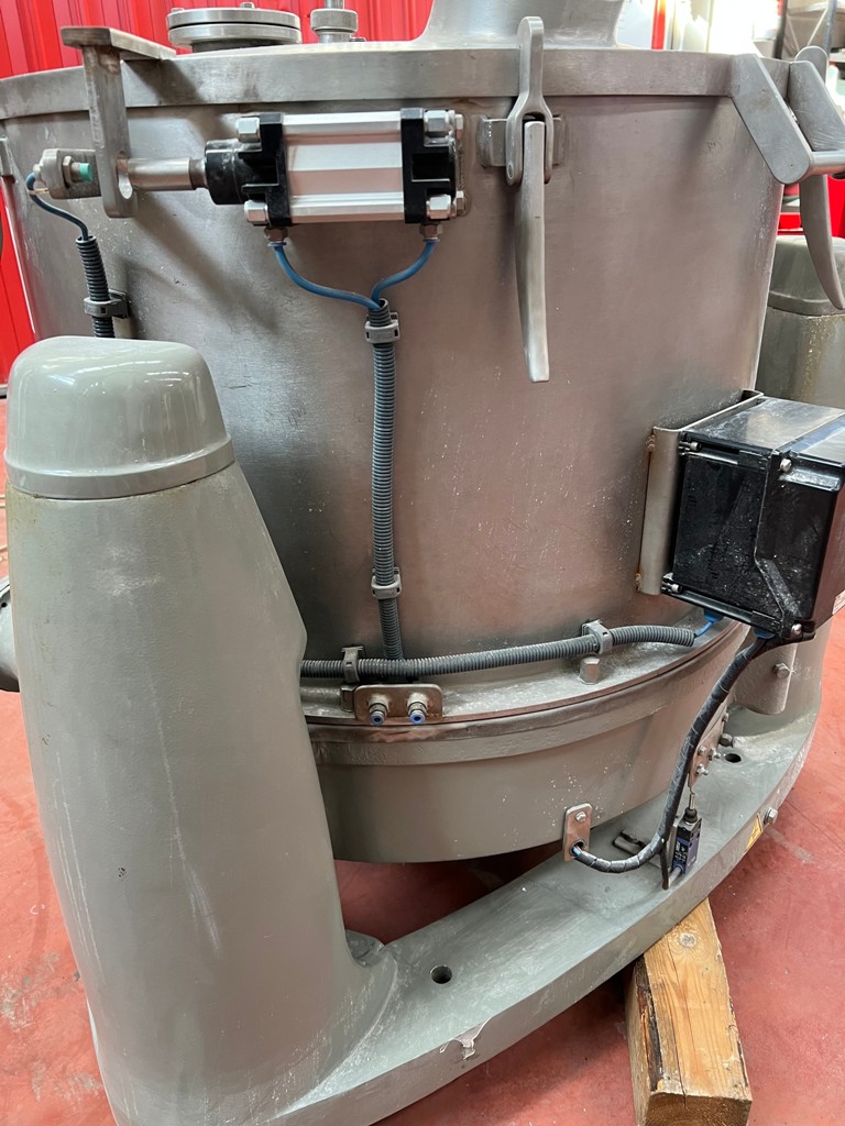 Max bowl speed 1300 RPM, 661 x G, 700 x 400mm basket ID, max load 96 kg, volume 77 L, top unload, hinged cover, sight glass, feed and rinse pipes, 5.5 KW XP motor 400/690/3/50/1455 RPM. Reconditioned to "as new" with full mechanical warranty. Located in Europe.