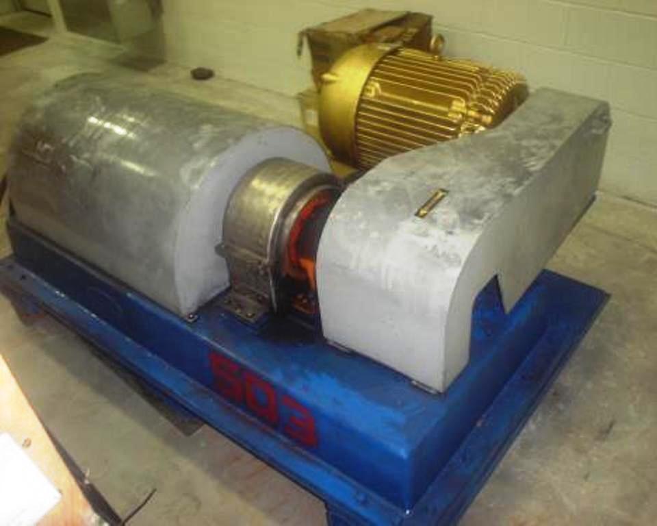Max bowl speed 5000 RPM, 4400 x G, 12.6" x 36" bowl ID, effluent discharged under pressure. 2.5" double lead hardsurfaced conveyor, 15 HP motor 460/3/60/3600 RPM, 35:1 cyclo gearbox, belt guard, feed tube, vibration switch/isolators and control panel. Reconditioned and unused since.