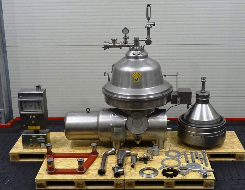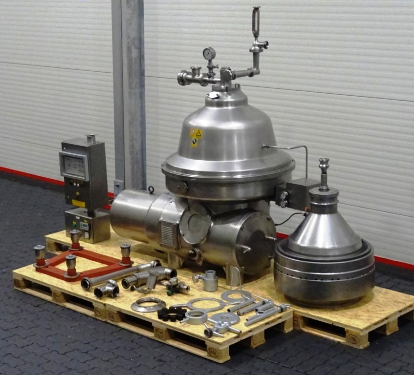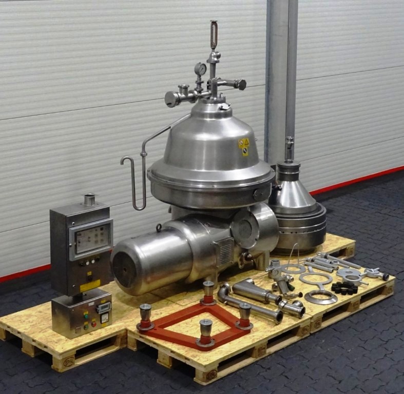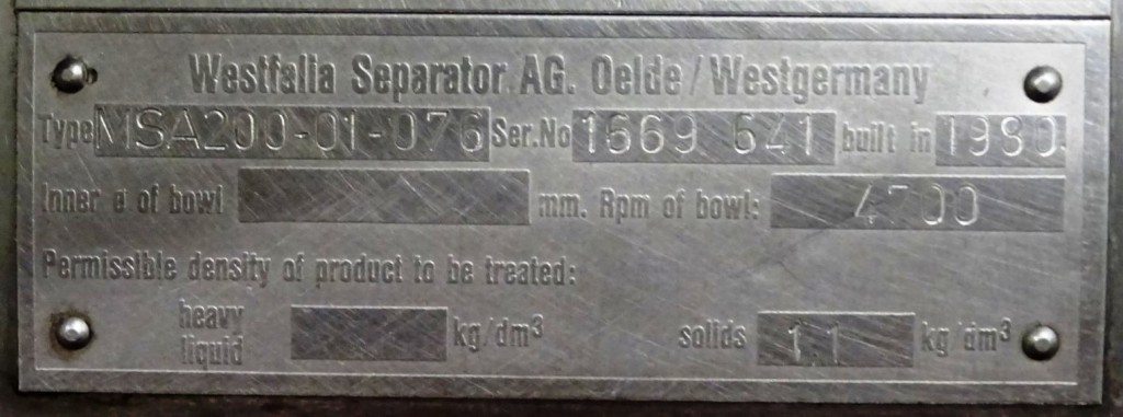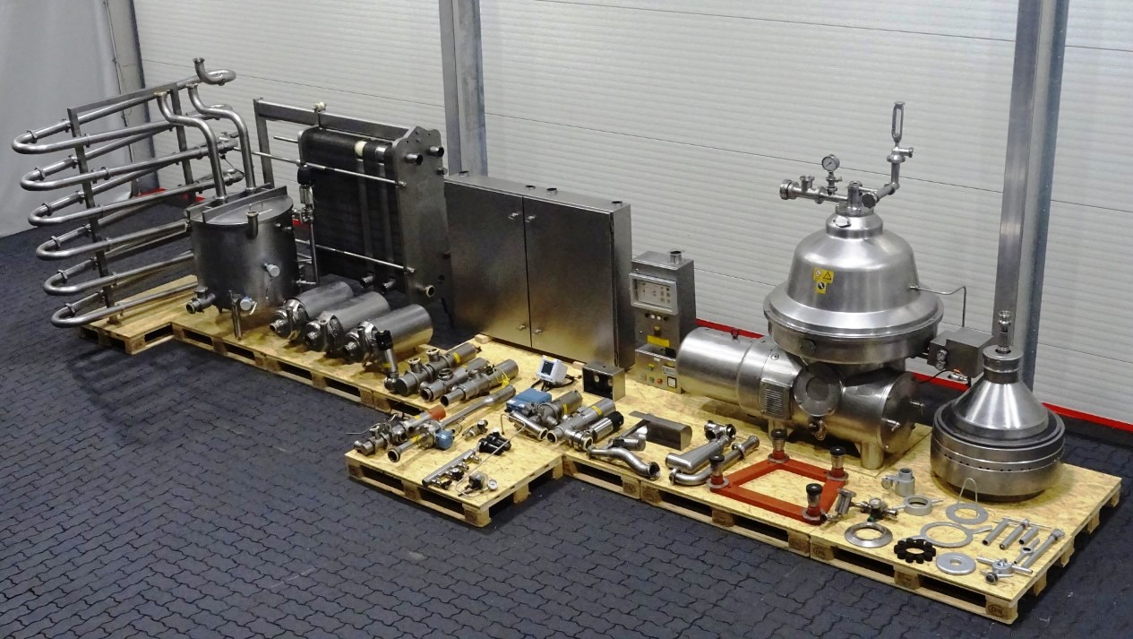 Includes APV N35 RKS plate heat exchanger for milk (4 sections), rated @ 25,000 LPH, 6 bar pressure, 2004 vintage. APV Puma product and booser pumps, Rosemount and Yogakawa digital flow transmitters. Westfalia MSA 200-01-076 milk separator, max bowl speed 4700 RPM, rated @ 25,000 LPH skimming, 37 KW motor 420/3/50/1475 RPM, counter pressure valve on inlet, manometer, manual flow regulation valve and flow indicator for cream, water valves, foundation frame, sludge tank, all inlet/outlet piping, tools and control panel. 1980 vintage. Very good condition. Located in Europe.