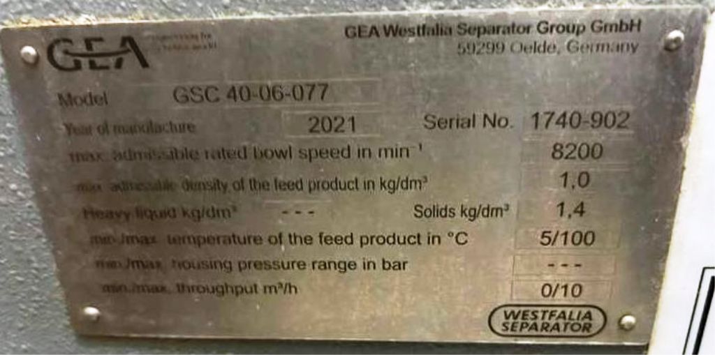 Max bowl speed 8200 RPM, rated @ 14,000 LPH, 4 L solids space, 6 bar pressure. Hydrohermetic product feed, hydry ejection system, liquid discharged via centripetal pump, 18.5 KW motor 460/3/60/3550 RPM, solids cyclone, turbidity meter, feed and solids pumps, tools, spares and Allen-Bradley Panel Plus 1000 control panel. Unitized on a portable skid. Prior use: Craft brewery. 2021 vintage. Excellent condition. Equivalent to: HB05-SL Plug & Brew 100. Located in Canada.