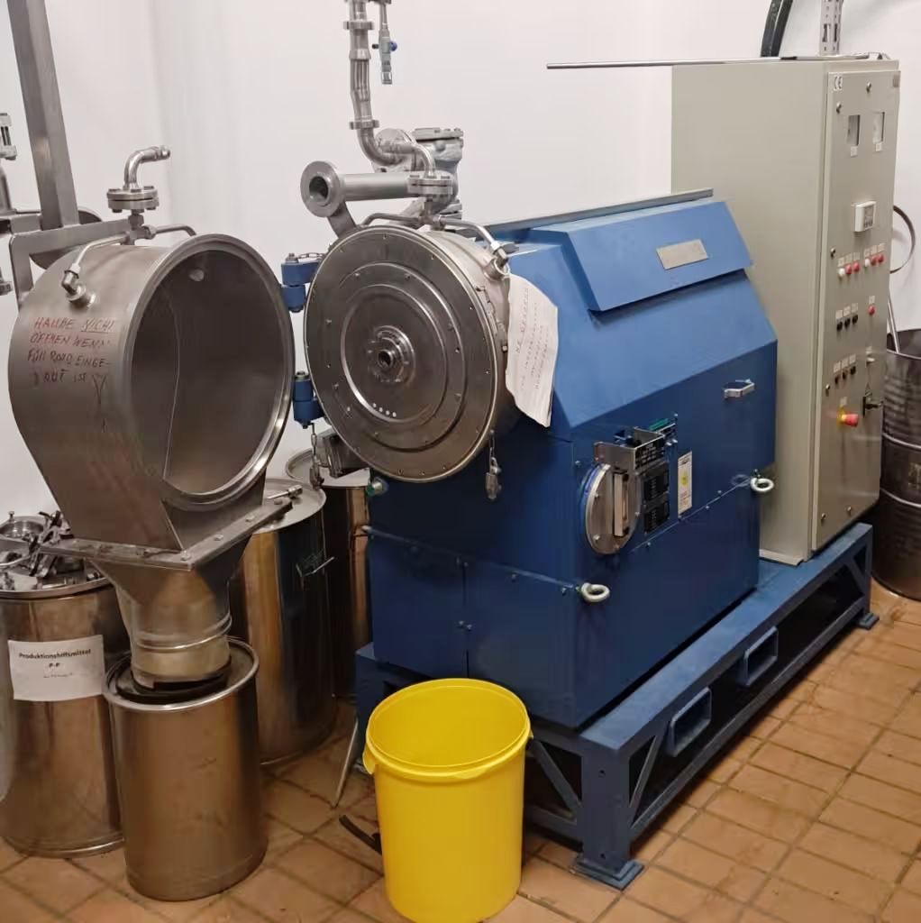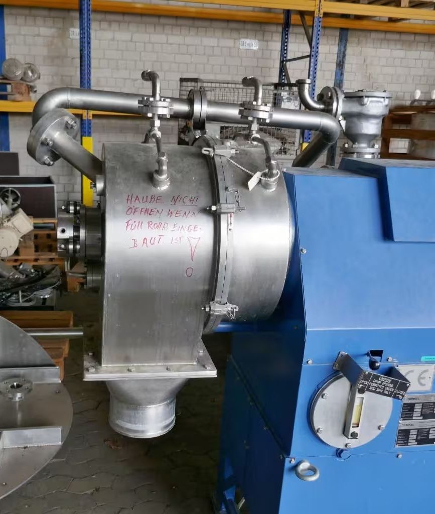 Equipped with a powerful 4 KW explosion-proof hydraulic motor operating at 380/3/50/2875 RPM, the Heinkel HF 300 delivers reliable and consistent performance. Additionally, the 1 KW explosion-proof pump motor enhances the system's efficiency, ensuring that the feed material is effectively introduced into the centrifuge for optimal separation. The included control panel and manuals facilitate user-friendly operation and maintenance, allowing operators to monitor and adjust settings with ease. This centrifuge, dating back to 2000, has been maintained in excellent condition, making it a valuable asset for any facility looking to enhance their separation capabilities. Located in Europe, it is readily available for industries seeking to improve their production processes with a reliable and efficient centrifuge.