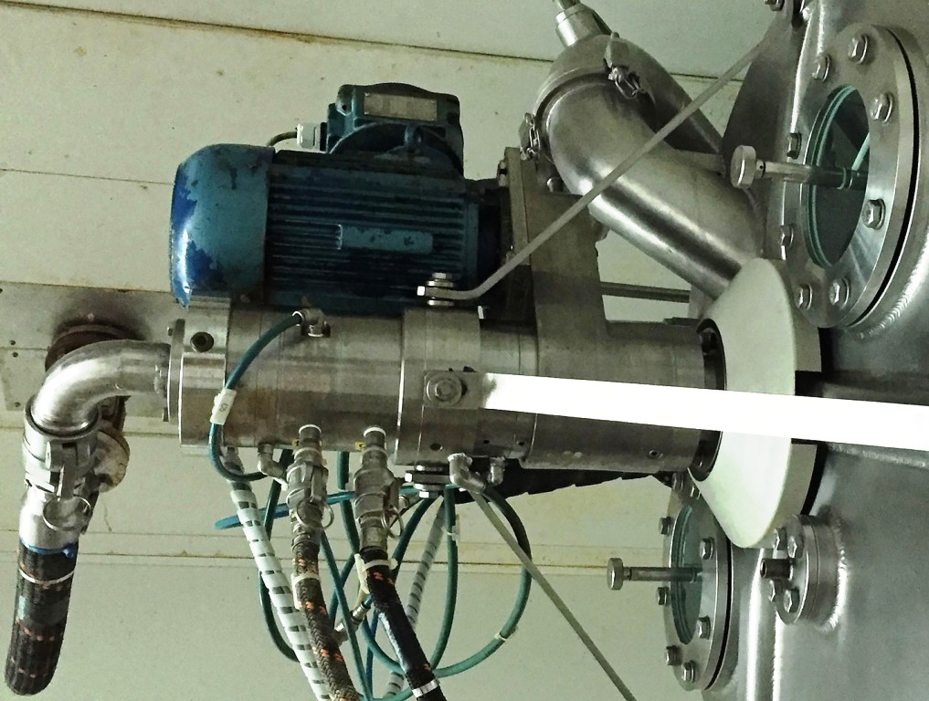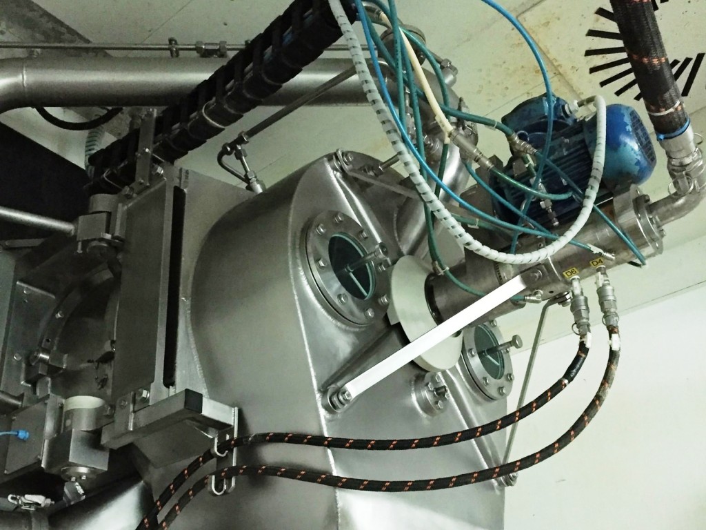 Max bowl speed 1936 RPM, 1250 x G, 0.45 sqM filter area, max volume 52 L, max load 65 kg. Pharmaceutical grade finish, EPDM seals and polypropylene filter cloth. Hydraulic motor and pumping unit with 18.5 KW motor 415/3/50/1450 RPM, 4 KW inverting mechanism motor, .75 KW feed pump motor, vibration dampers and control panels, mounted on a stand. 1985 vintage. Excellent condition. Located in Europe.