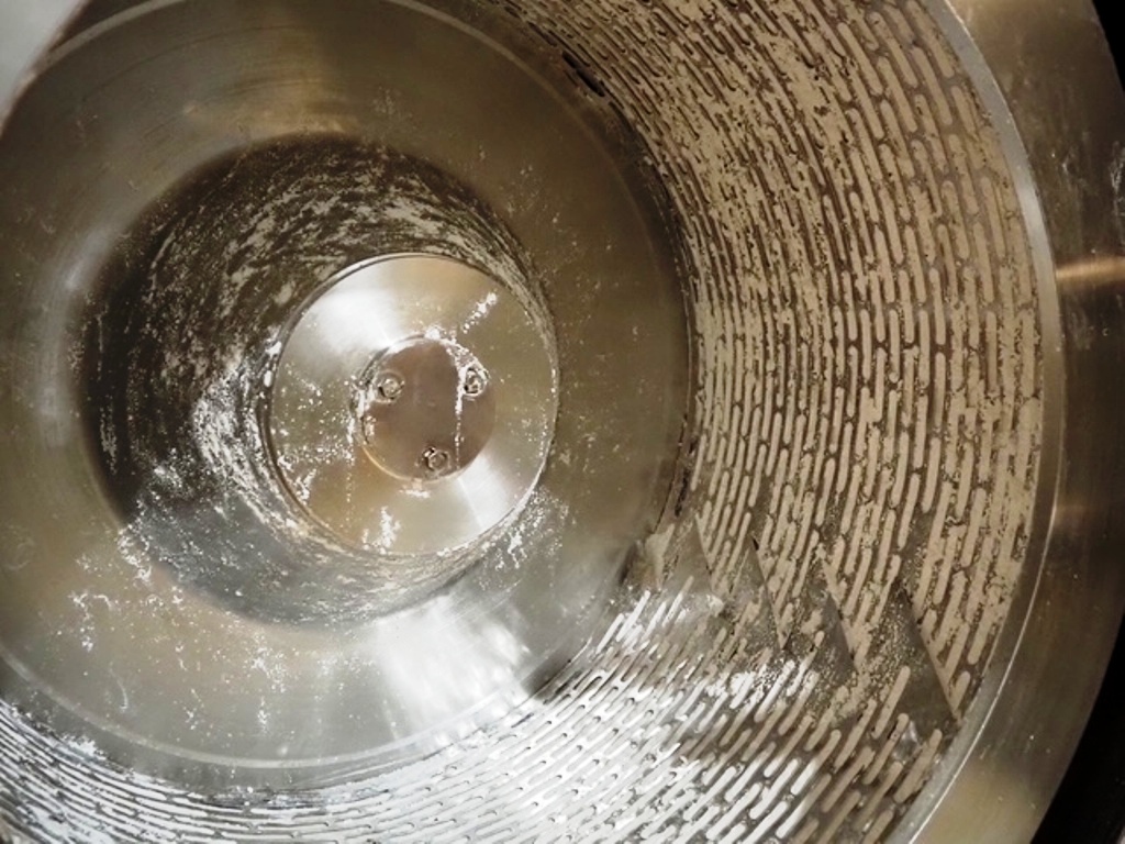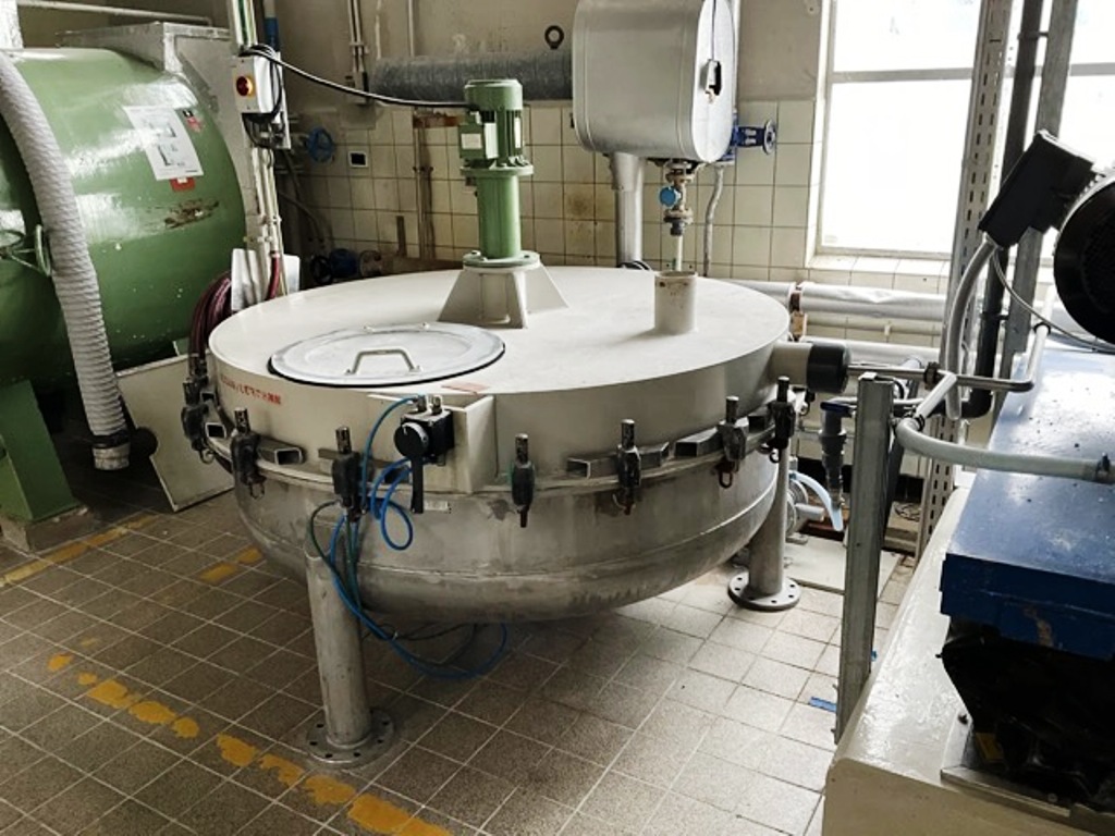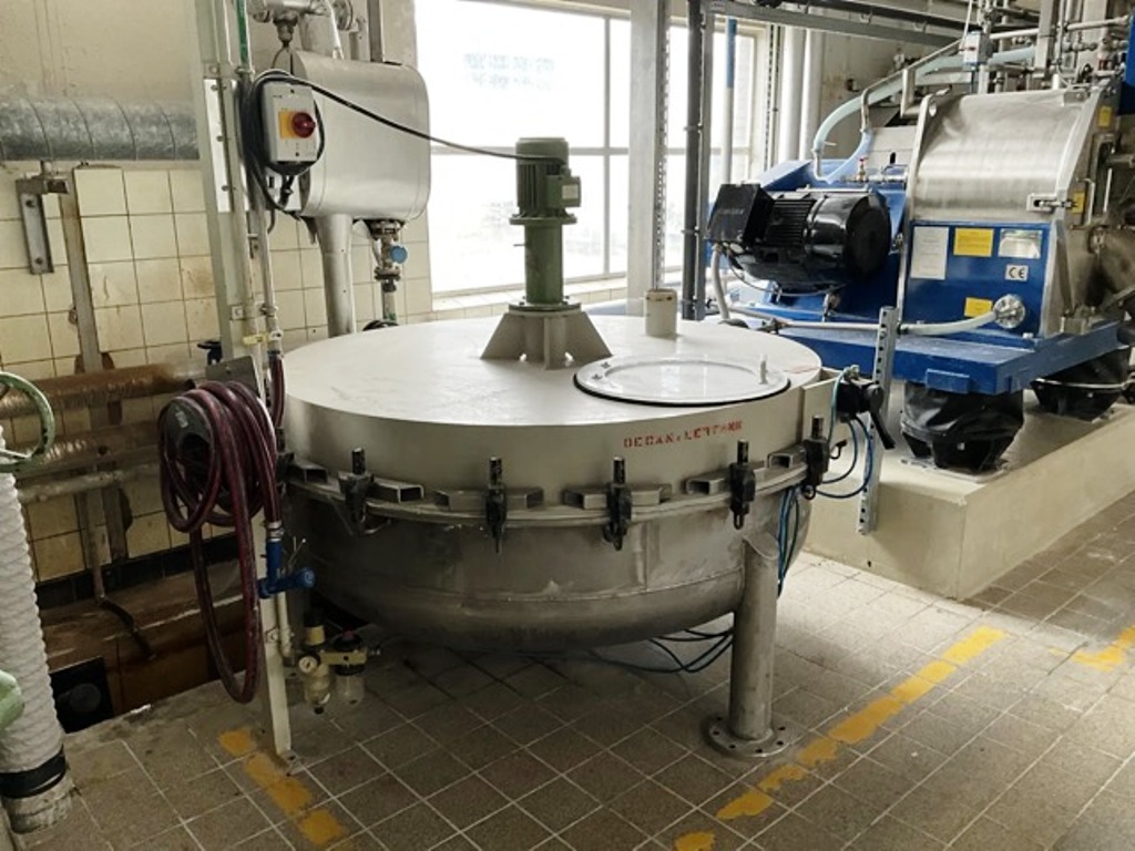 Max bowl speed 3000 RPM, 3170 x G, 630 x 370mm perforate basket ID, 0.73 sqM filtration area, 47.7 L volume, max load 63 kg. 22 KW motor 380/3/50/1455 RPM, belt guard, feed and wash pipes, broad knife plow, discharge screw, gas purging of bearing seals, door interlock, sight glass, speedometer, vibration monitor, constant temperature circulating bath, oil lubrication system, mounted on inertia base with vibration isolators, touch screen controller and PLC control panel with VFDs. 2011 vintage. Excellent condition. Located in Europe.