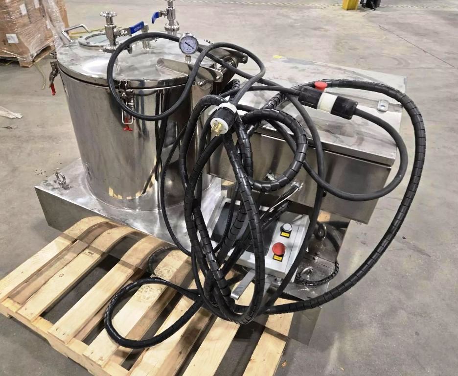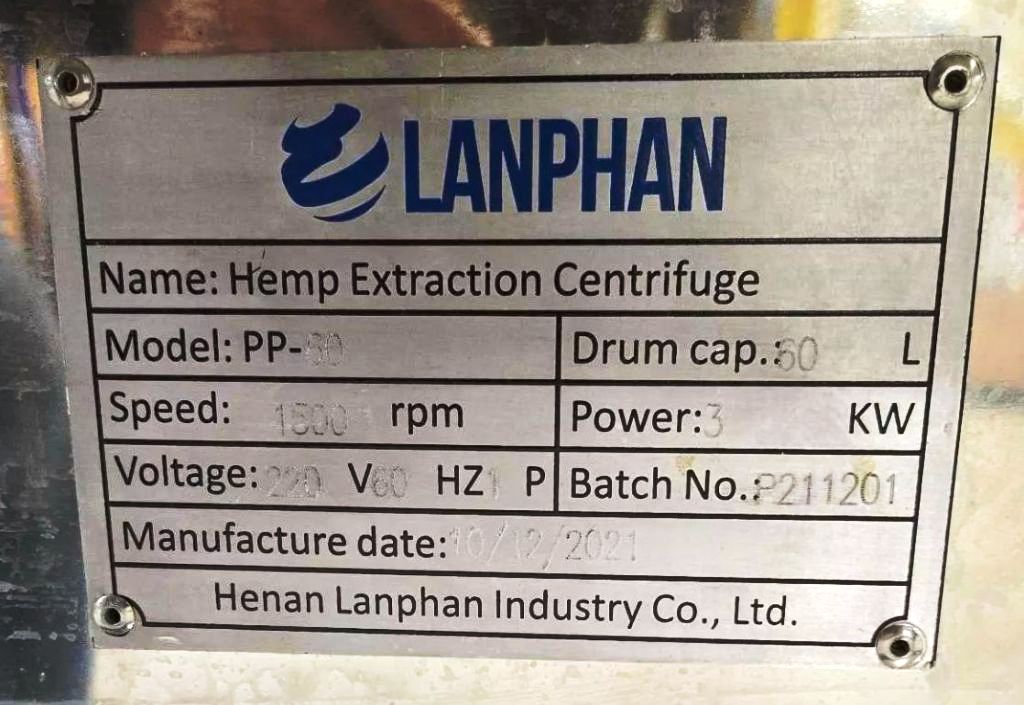 Constructed from high-quality 316L stainless steel, the Lanphan PP-60 is built to withstand the rigors of industrial use while maintaining a sanitary design that meets stringent health and safety standards. The vacuum jacketed insulation layer minimizes heat transfer, ensuring that the extraction process remains efficient and effective. This centrifuge is equipped with a robust 3 KW XP motor, operating at 460V/3/60, which provides the necessary power for high-speed operations. The reinforced sight glass allows for easy monitoring of the extraction process, while tri-clamp fittings for feed and drain ports facilitate quick and secure connections, enhancing the overall user experience. The skid-mounted design, complete with vibration isolators, ensures stability during operation, while the integrated control panel with variable frequency drive (VFD) allows for precise control over the centrifuge's performance, making it adaptable to various extraction requirements.