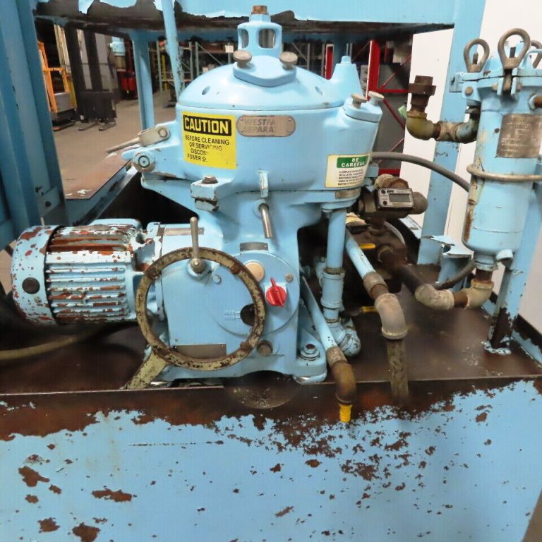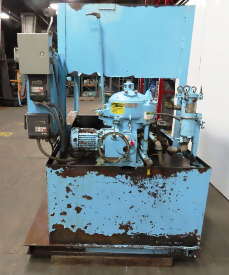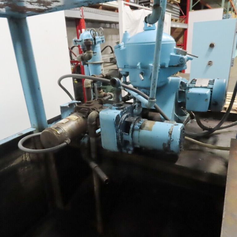 Consisting of (1) Westfalia OTB 2-00-006 manual clean disc centrifuge, 316SS. Max bowl speed 9380 RPM, rated @ 1400 LPH, oil discharged under pressure, 1 HP motor 230/460/3/60/1750 RPM, Unimix coolant proportioning pump, Scrounger oil belt skimmer, 300 G dirty coolant tank, 450 G clean coolant tank and control panel. Very good condition.