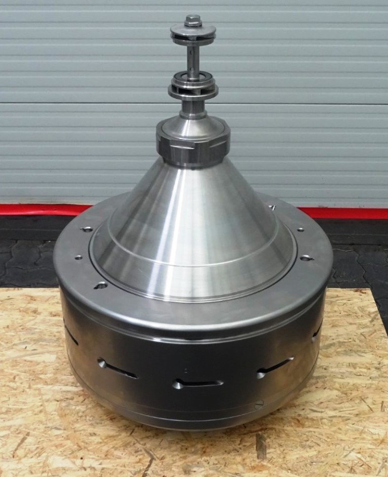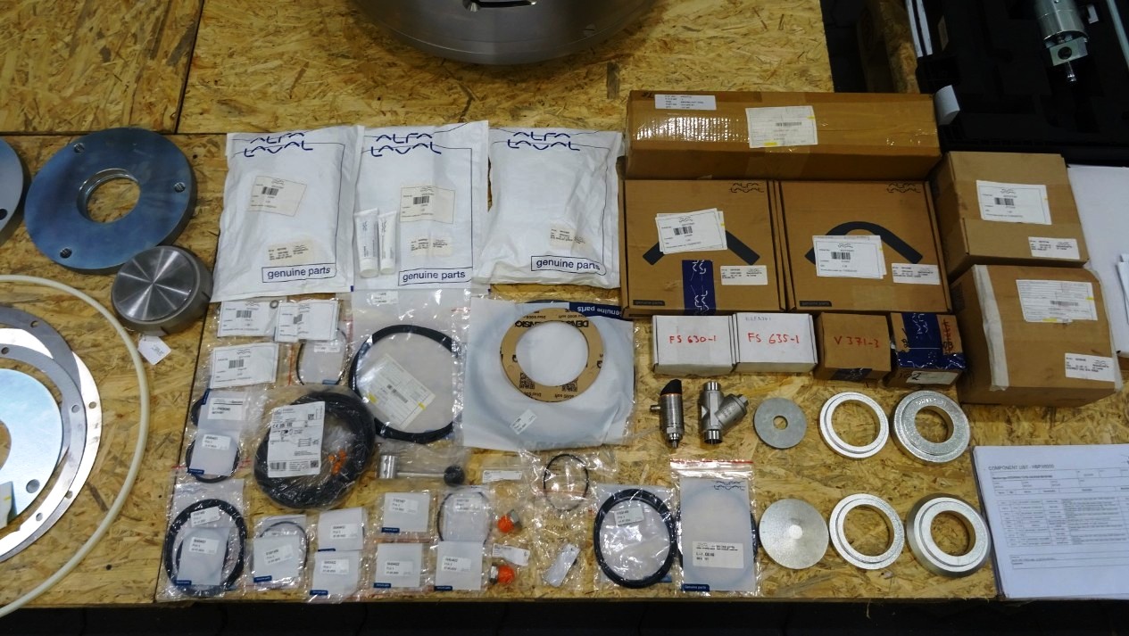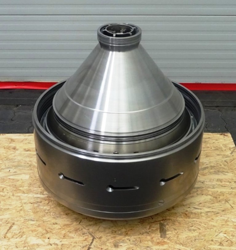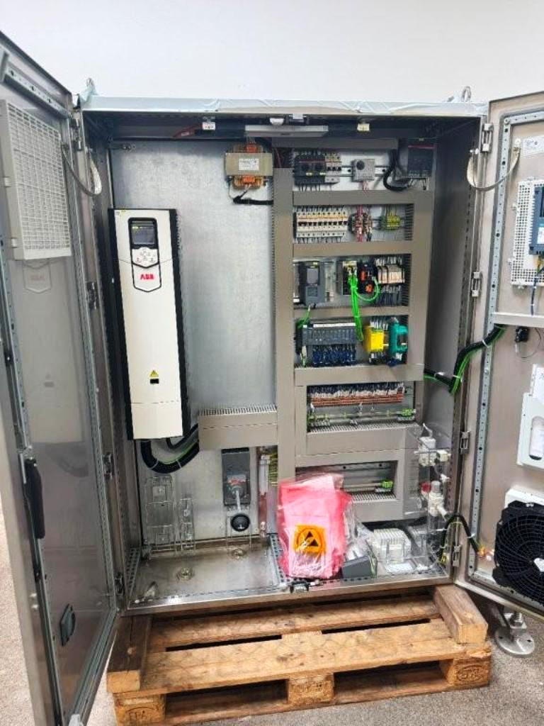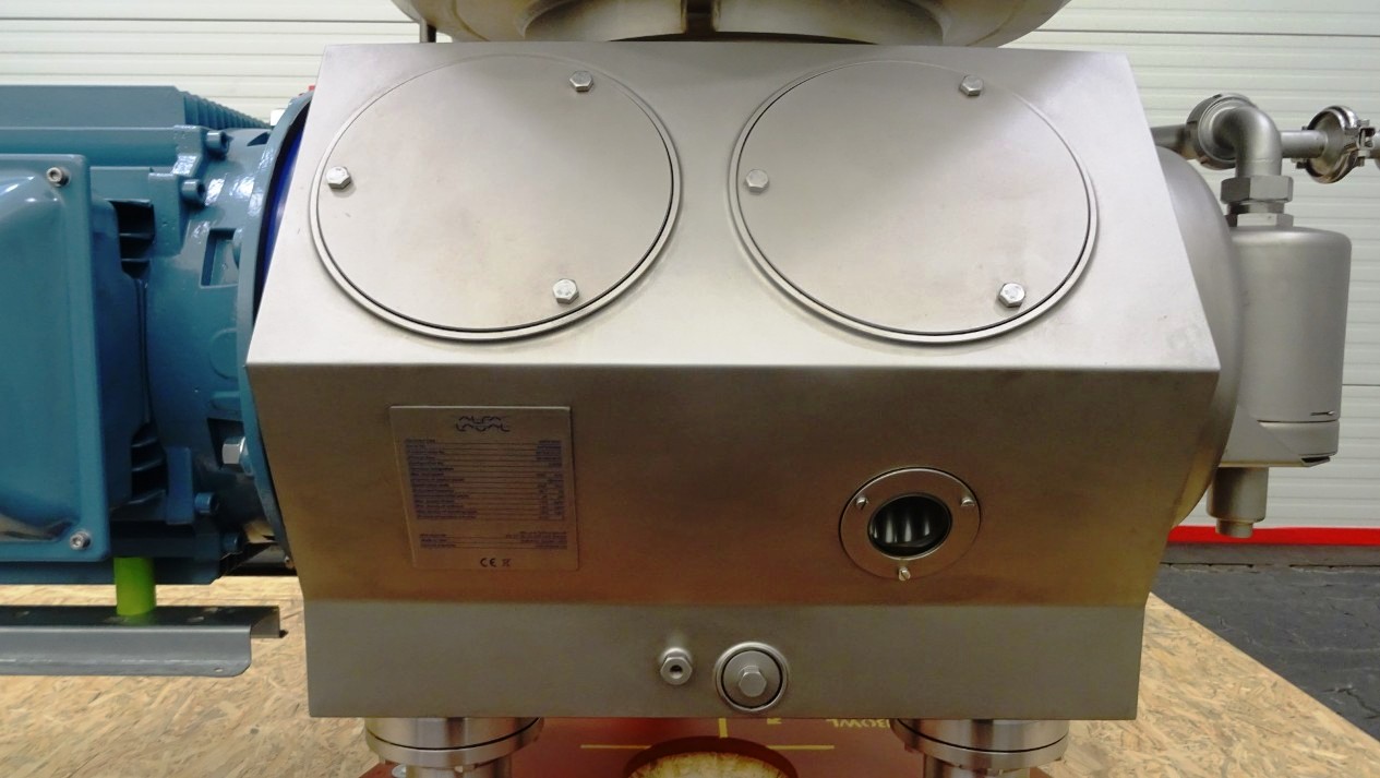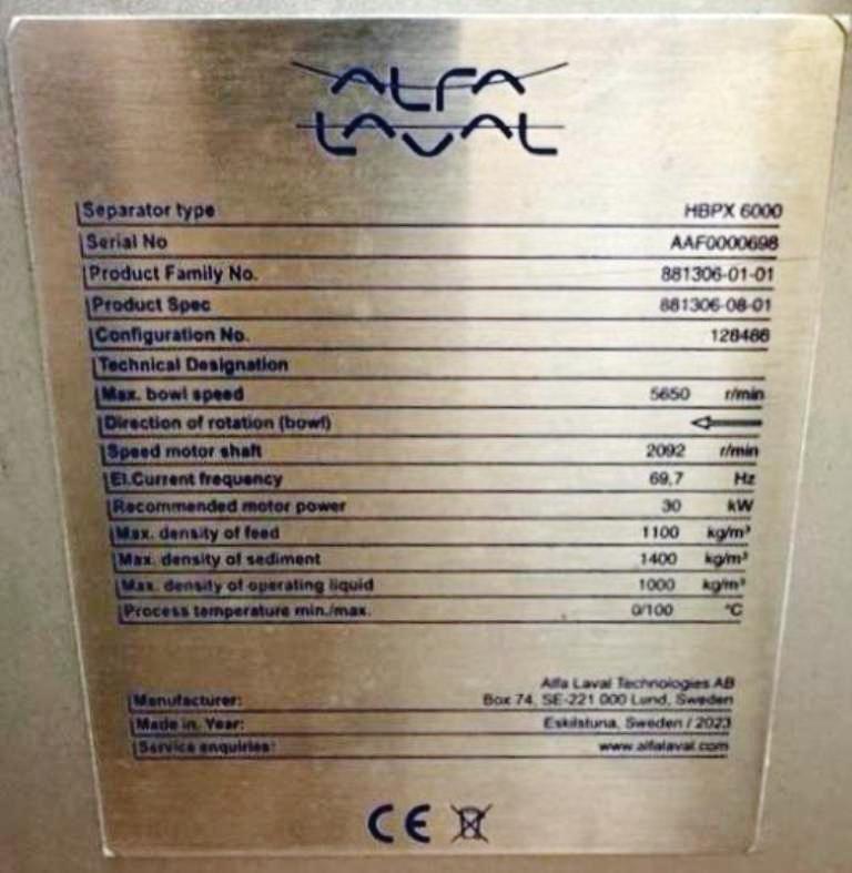 Max bowl speed 5650 RPM, rated @ 6000 LPH, bowl volume 34 L, both liquid phases discharged under pressure via adjustable Centrizoom paring disc. 37 KW motor 400/690/3/50/1481 RPM, sludge cyclone, water harness, base frame, all valves, gauges and piping, tools, spare parts, manuals, standard process liquid unit mounted on a SS skid and PLC control panel with VFD and touch screen HMI. 2023 vintage. Never used. Located in Europe.