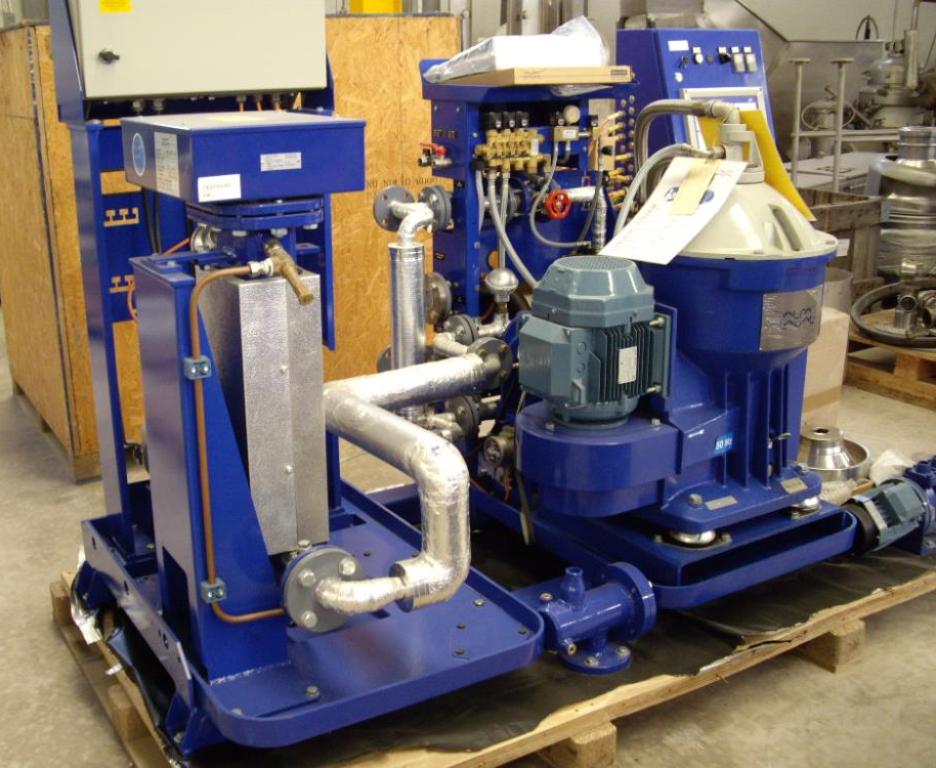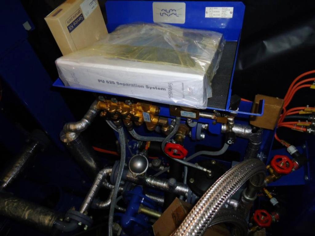 Max bowl speed 12,088 RPM, both liquid phases discharged under pressure, rated @ 2400 LPH on light viscosity oil (380 cSt @ 50C). 5.5 KW motor 380/3/50/2860 RPM, tools, feed pump, 22 KW heater, water harness and control panel. Never used.