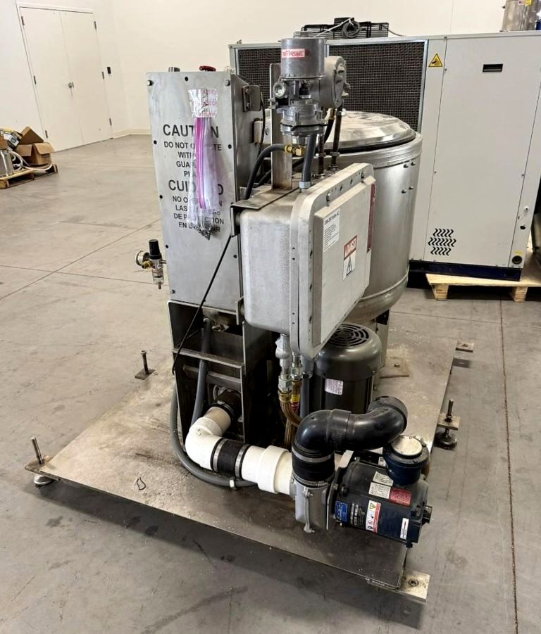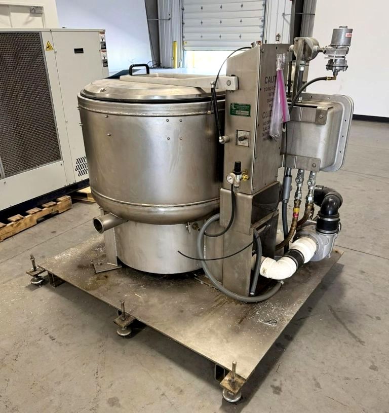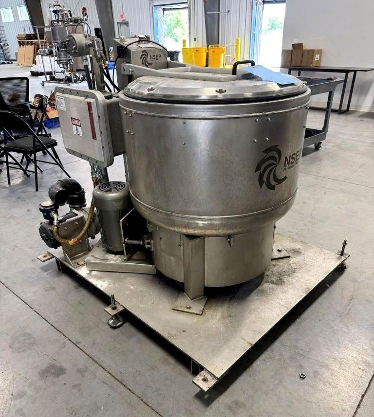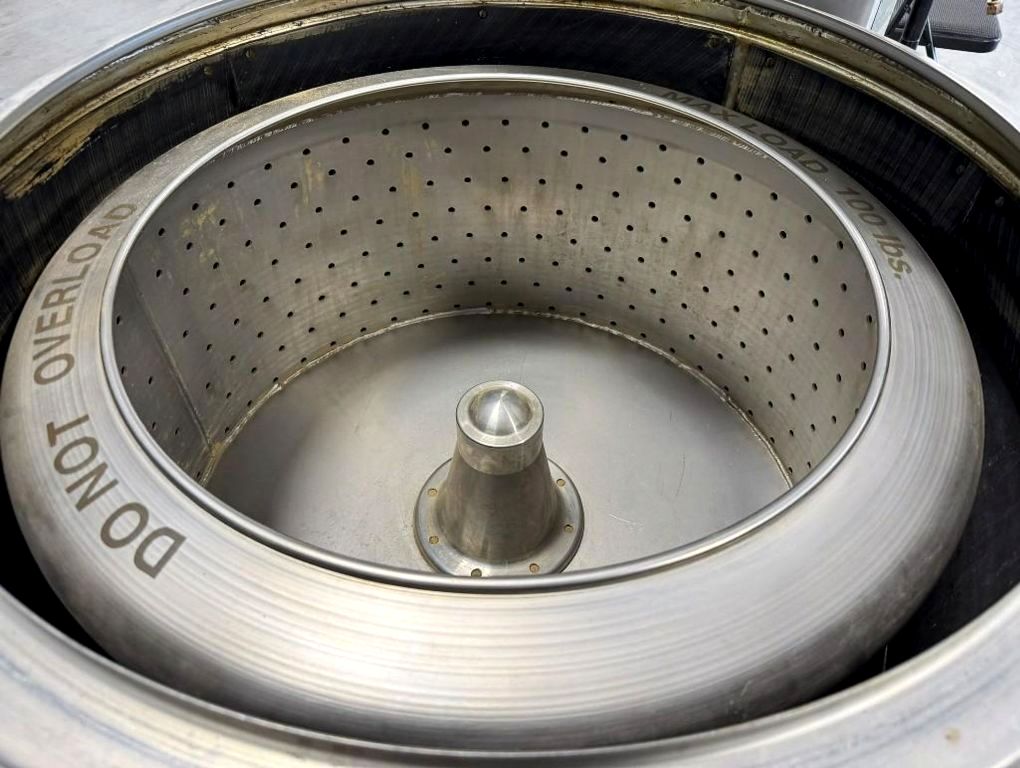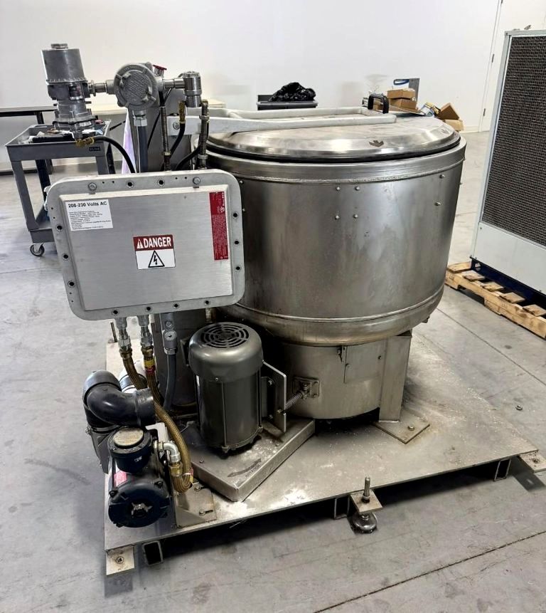 Max bowl speed 1740 RPM, 1200 x G, 6.54 cu ft/100 lbs capacity, 30 x 16" basket ID. 5 HP XP motor 480/3/60/1800 RPM, fume purge system and XP timer controls, mounted on a SS skid. 2019 vintage. Excellent condition.