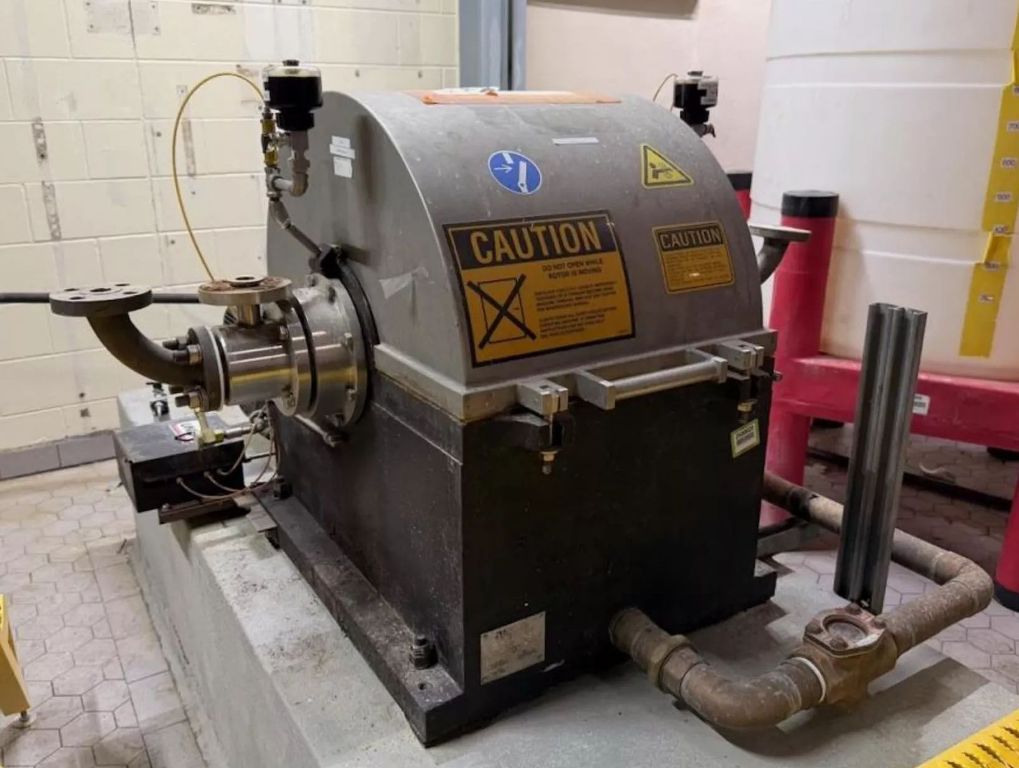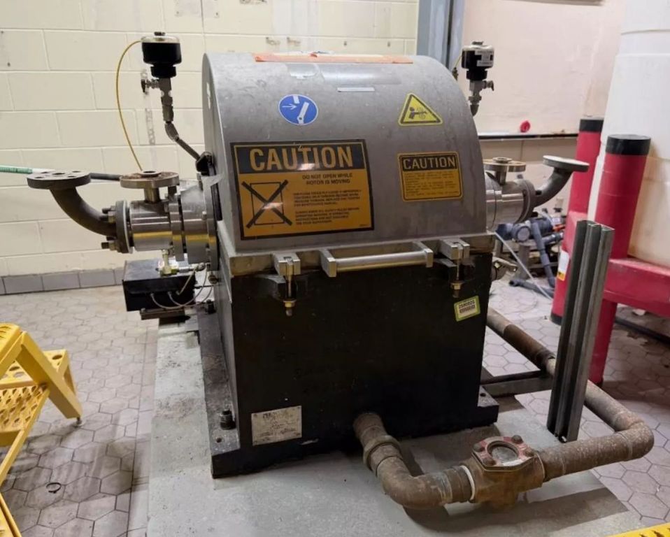 Max bowl speed 3200 RPM, 250 PSI/250 F max, rated @ 40 GPM (9000 LPH) for multistage liquid/liquid extraction or washing, 25 GPM (6000 LPH) for broth fermentation. 10 HP motor 575/3/60/1525 RPM, mechanical seals, relay controls and pharmaceutical ASCO tubes. 2003 vintage. Very good condition. Located in Canada.