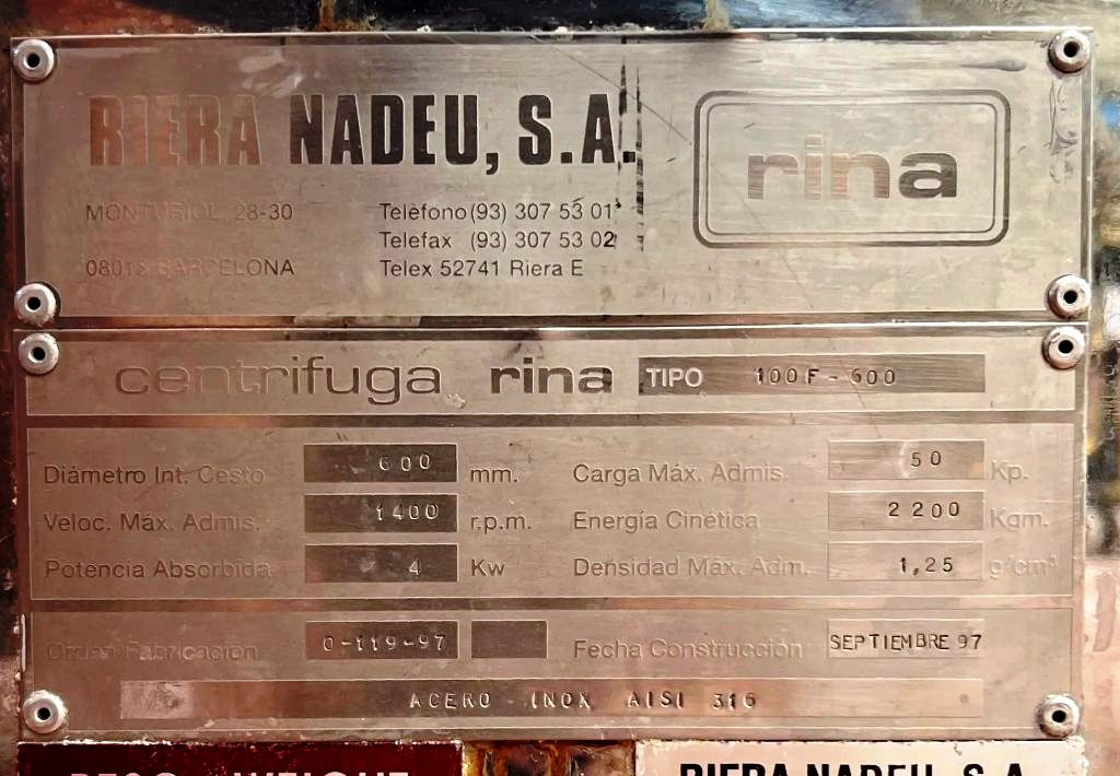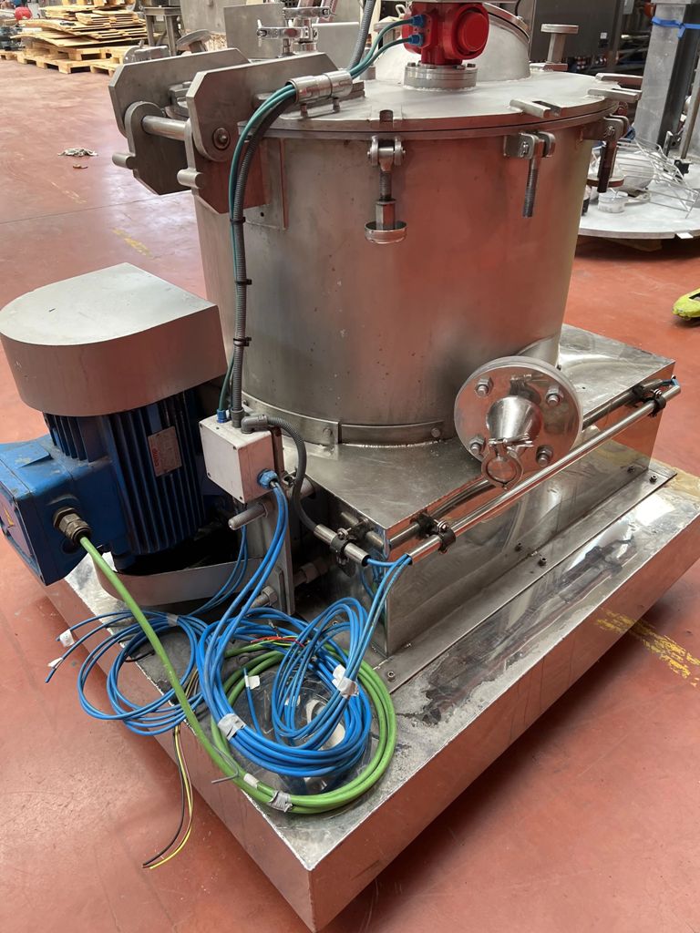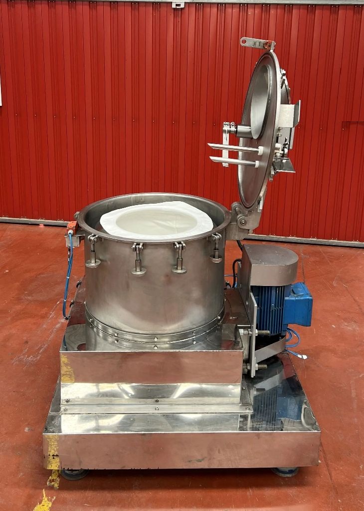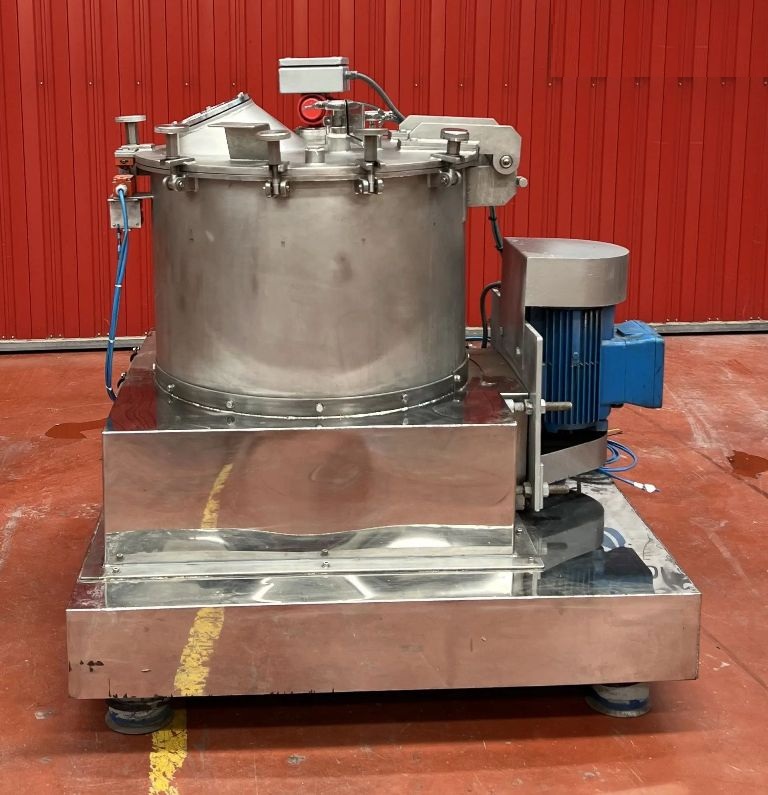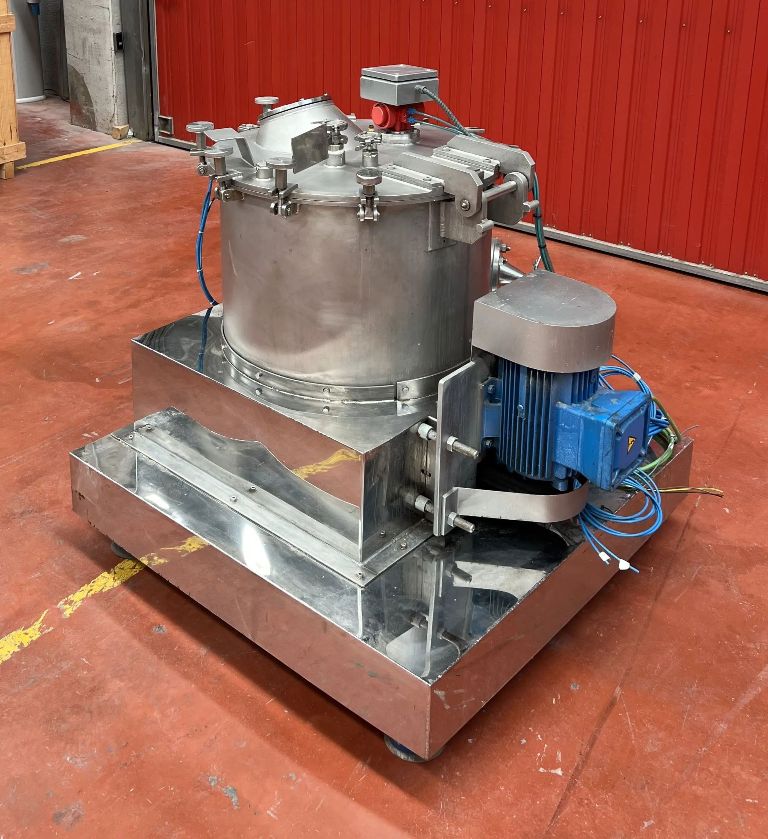 Max bowl speed 1400 RPM, 657 x G, 600 x 320mm (23.6 x 13.8") basket ID, 40 L basket volume, max load 50 kg. 4 KW motor 380/660/3/50/1420 RPM, feed and rinse tubes, plow, sight glass, lid safety lock, flip-top design, vibration switch/isolators, mounted on a skid with control panels. 1997 vintage. Excellent condition. Located in Europe.