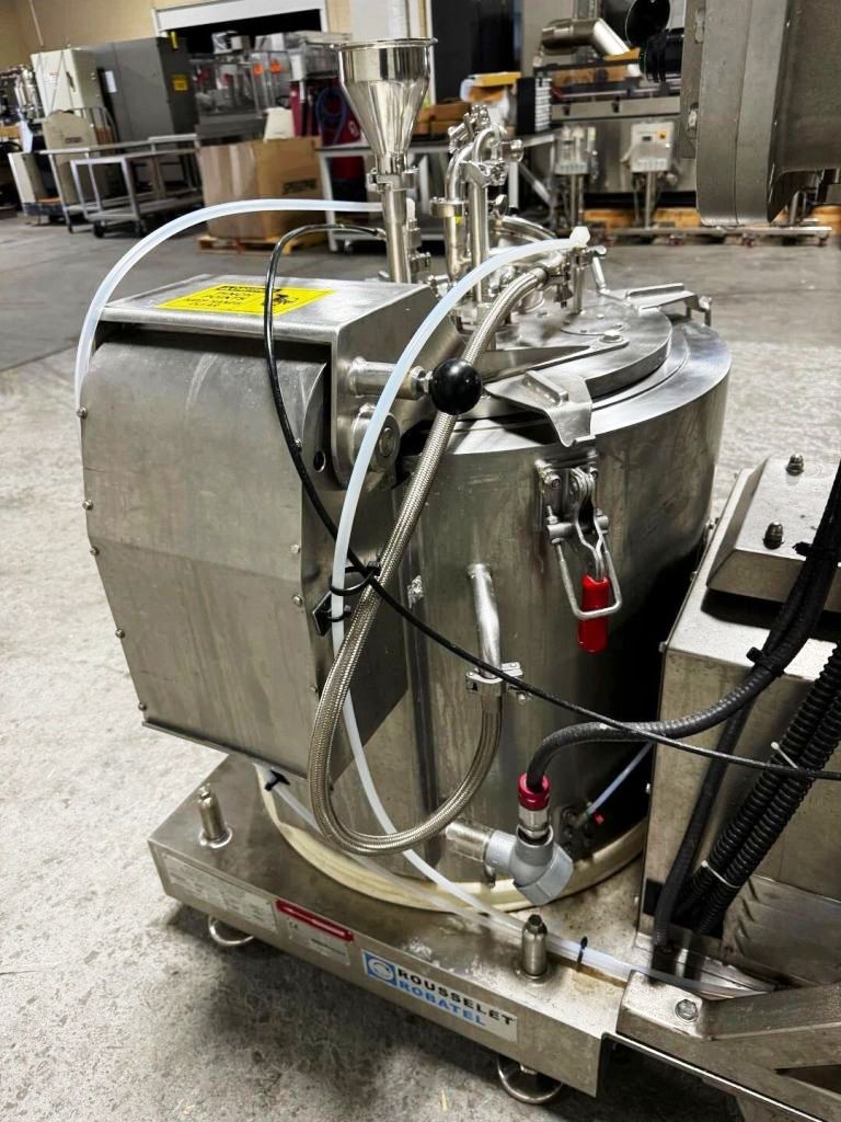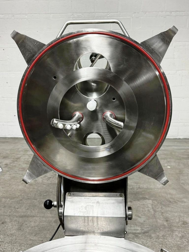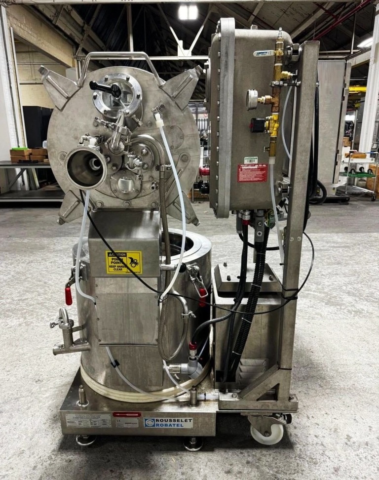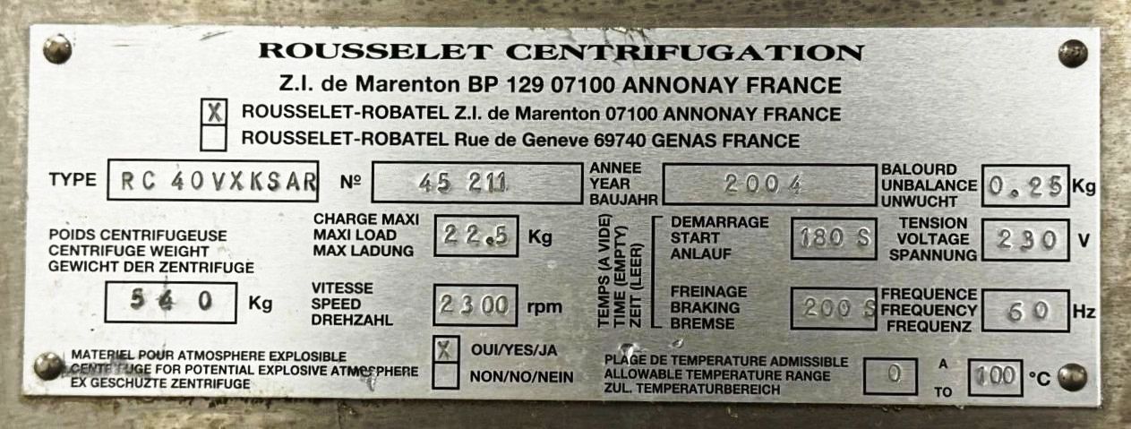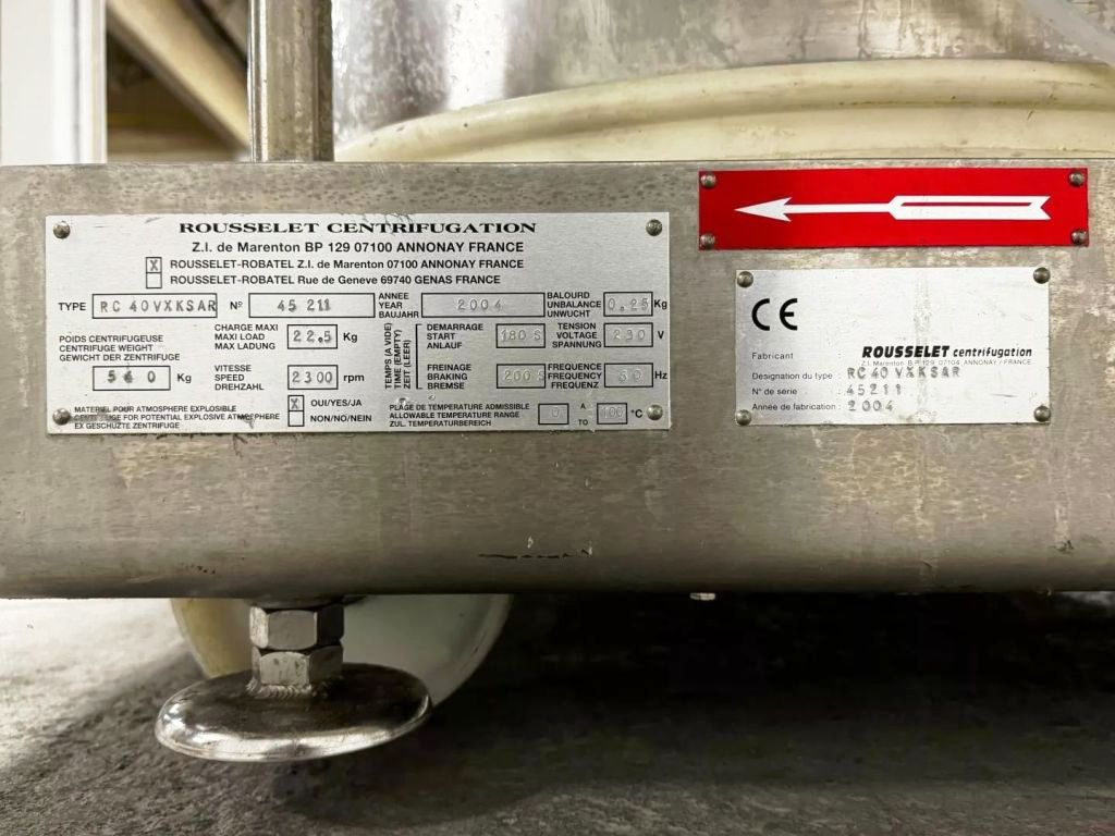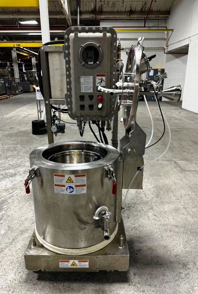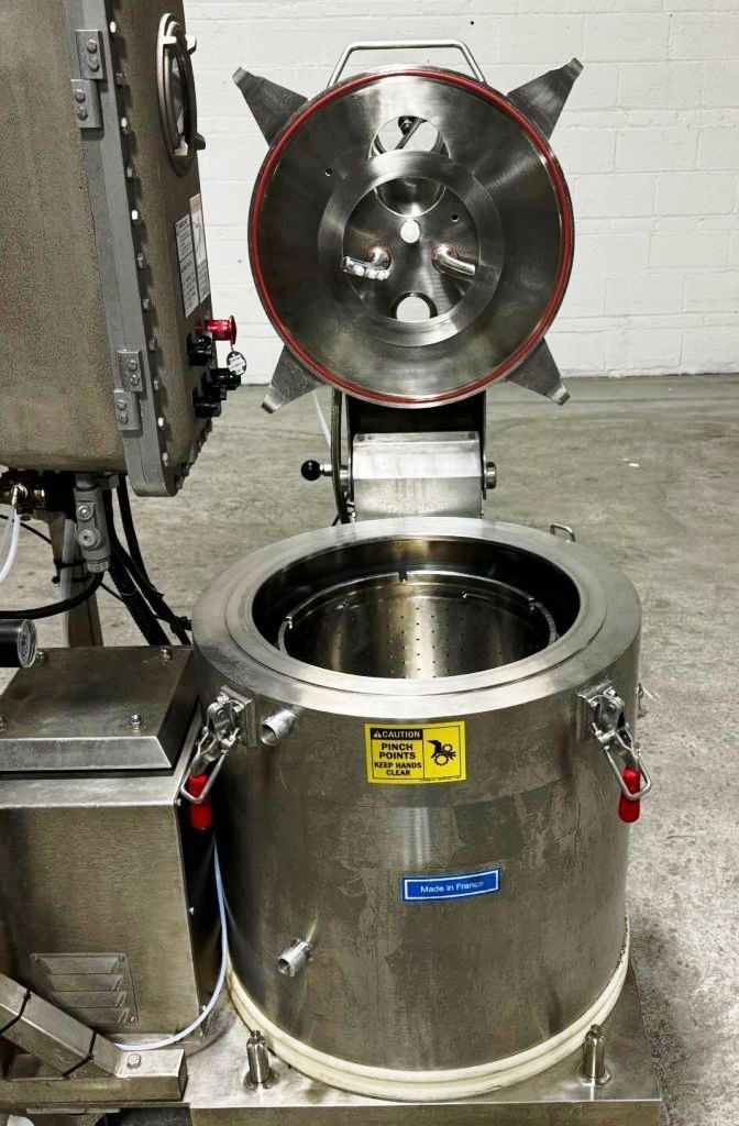 Max bowl speed 2300 RPM, 1183 x G, 400 x 280mm basket ID, 20 L volume, 22.5 kg max load. Top unload with hinged cover, jacketed housing, sanitary/CIP design, semi-automatic bag removal, sight glass with lamp, feed and rinse tubes, 4 KW XP motor 230/380/3/50/60, PTFE gaskets, PTFE spray nozzle, nitrogen blanketing system, hydraulic filtrate siphon, discharge membrane pump, and XP control panel, mounted on a portable cart. 2004 vintage. Excellent condition.
