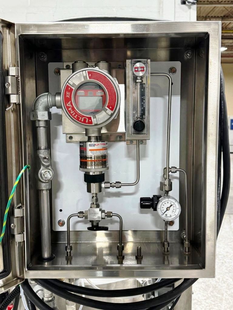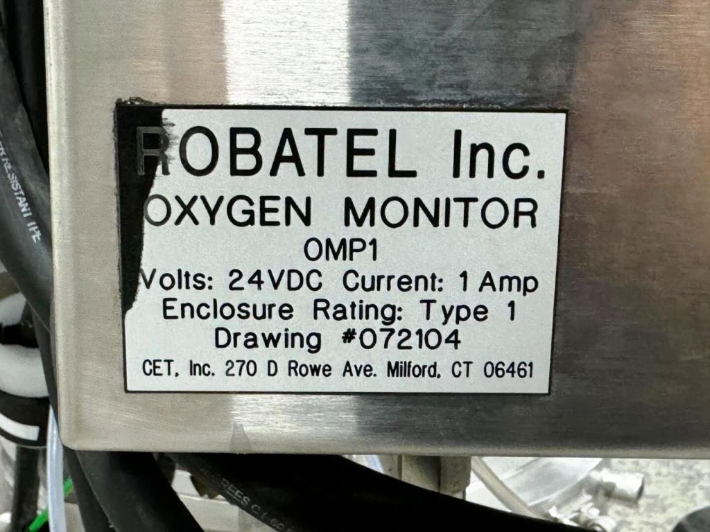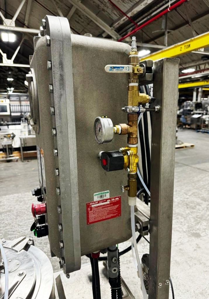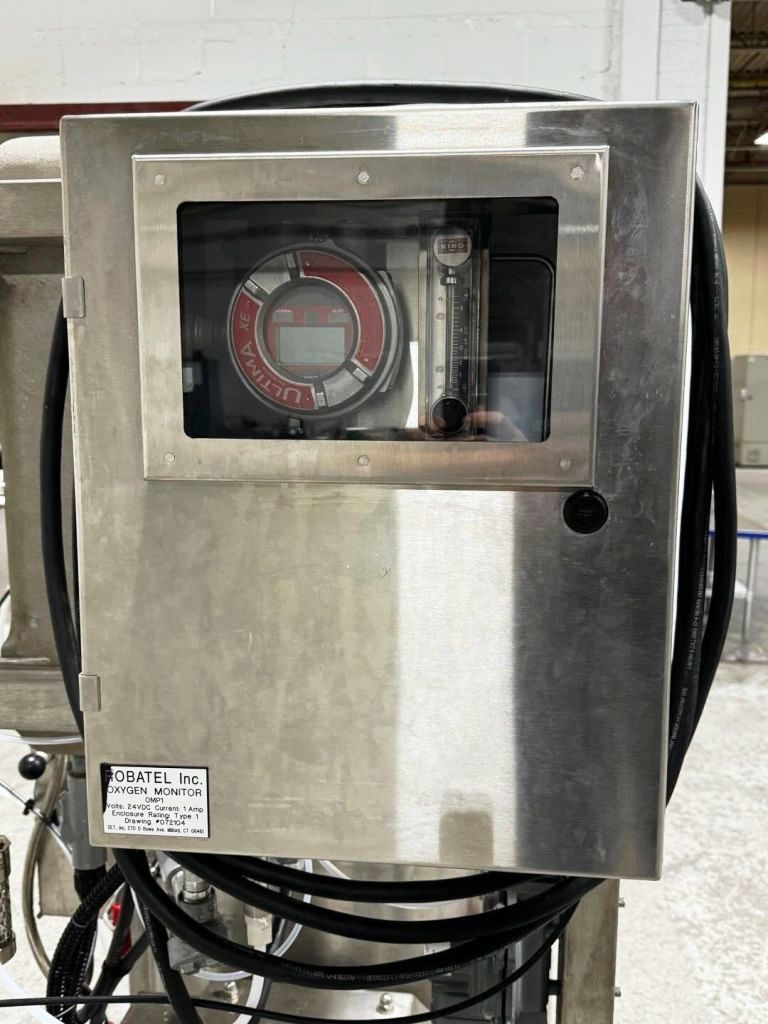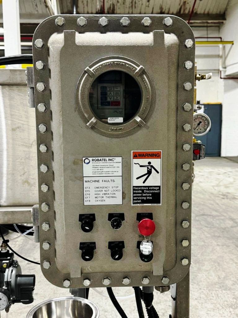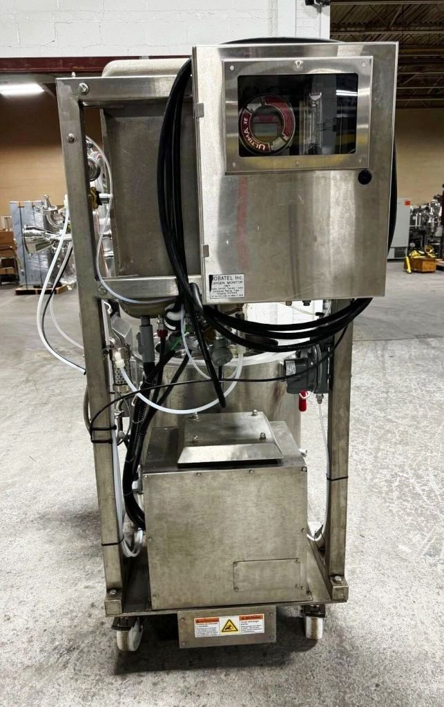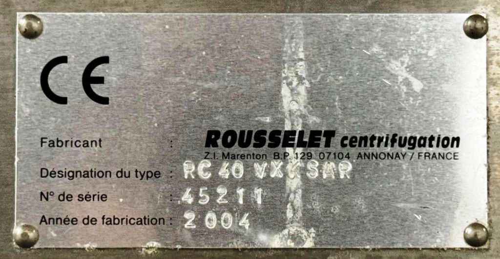 Max bowl speed 2300 RPM, 1183 x G, 400 x 280mm basket ID, 20 L volume, 22.5 kg max load. Top unload with hinged cover, jacketed housing, sanitary/CIP design, semi-automatic bag removal, sight glass with lamp, feed and rinse tubes, 4 KW XP motor 230/380/3/50/60, PTFE gaskets, PTFE spray nozzle, nitrogen blanketing system, hydraulic filtrate siphon, discharge membrane pump, and XP control panel, mounted on a portable cart. 2004 vintage. Excellent condition.