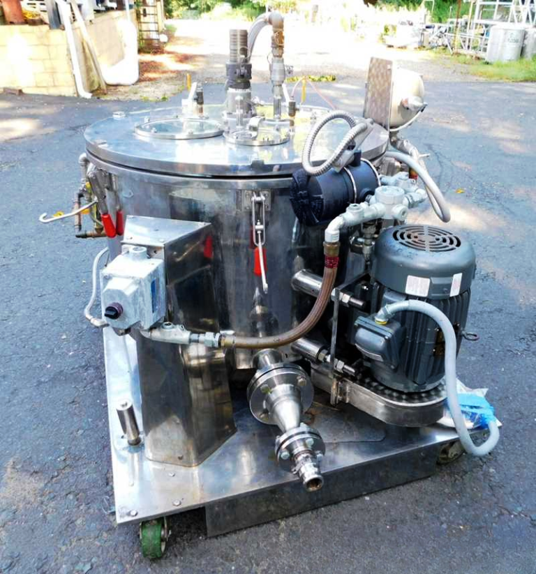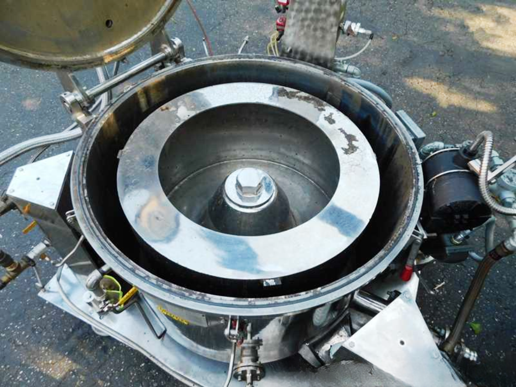 Max bowl speed 1450 RPM, 896 x G, 3.6 cuft capacity, 10.5 sqft filtration area, max load 342 lbs. Pharmaceutical grade, gastight design. 10 HP XP motor 230/460/3/60/1750 RPM, hinged top lid with toggle latches, 2 sight glasses, rotary spray ball, rapid gas purge system, liquid discharge pipe, mounted on SS base with casters and screw down floor pads, full documentation and original manual. Prior use: food processing. 2000 vintage. Very good condition.