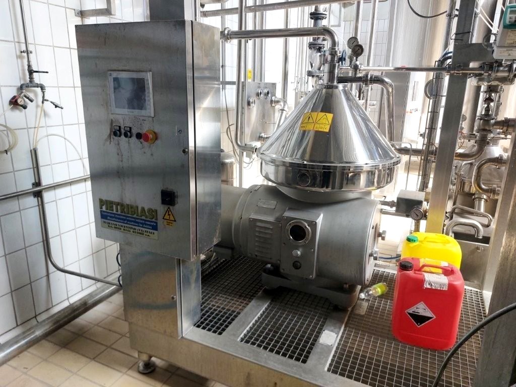 Max bowl speed 6500 RPM, milk skimming 18,000 LPH. 22 KW motor 380/3/50/1450 RPM, all valves and piping, unitized on SS skid with control panel, tools and manuals. Excellent condition. Located in Europe.