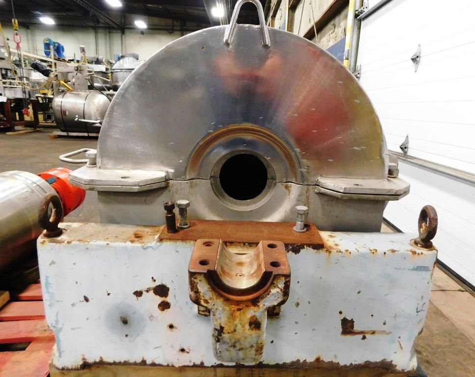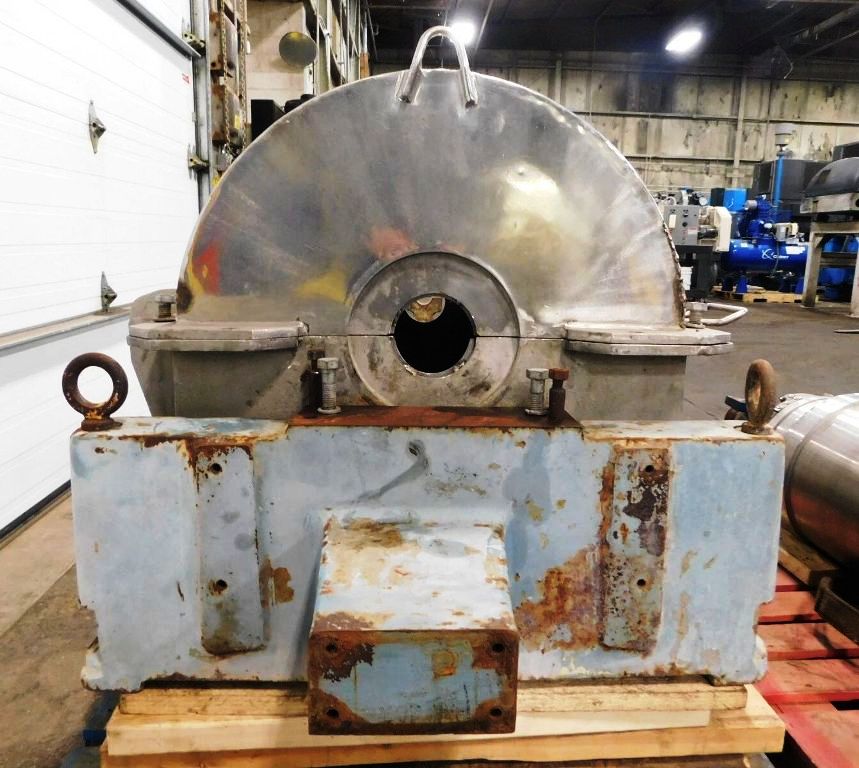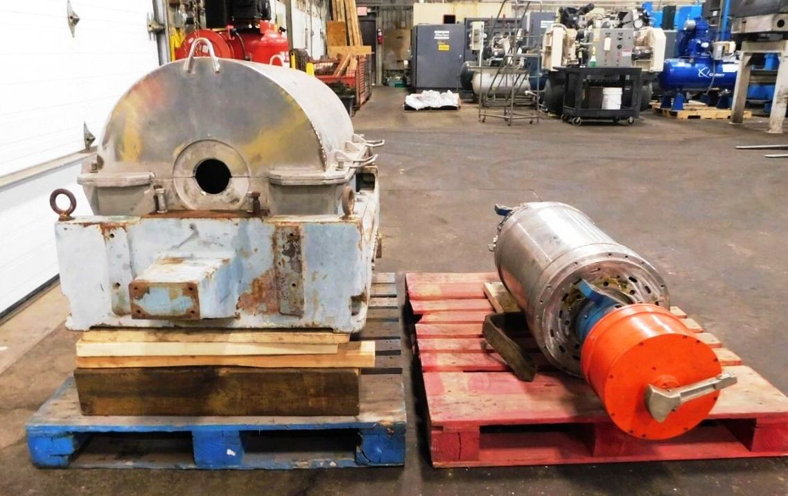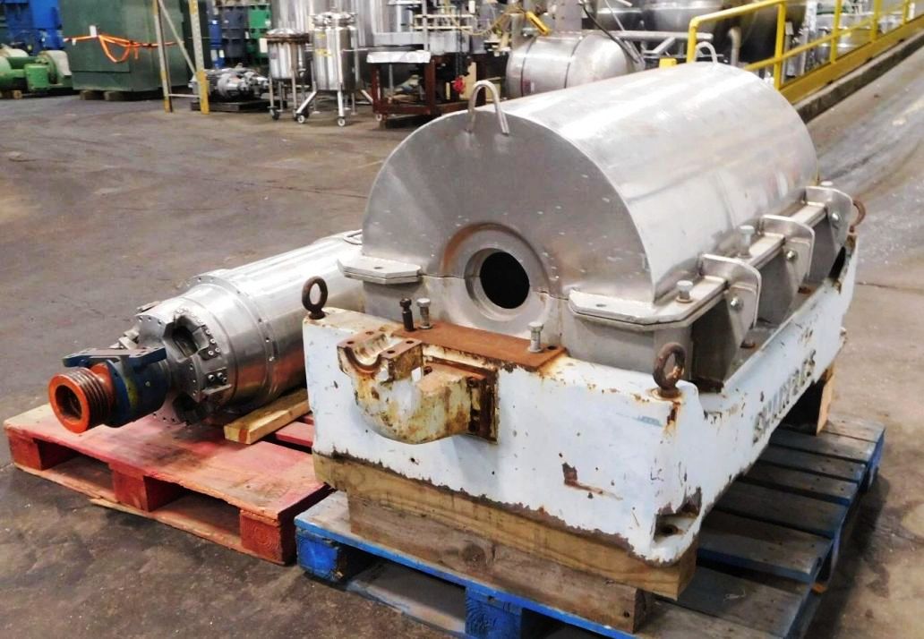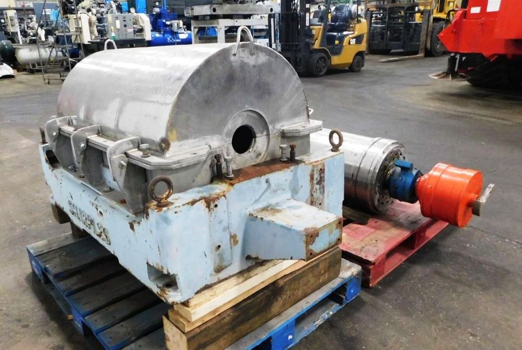 Max bowl speed 4000 RPM, 3180 x G, hogged-out cake ports, 3" single lead hardsurfaced conveyor, 125:1 gearbox, TA assembly, base, casing, pillow blocks and driven sheave. Reconditioned to "as new."