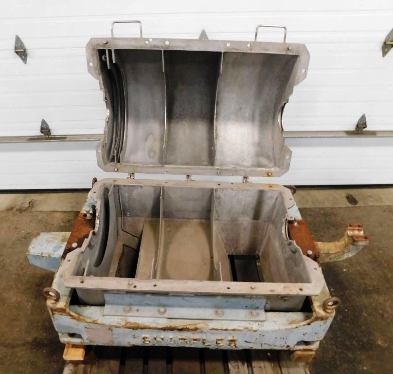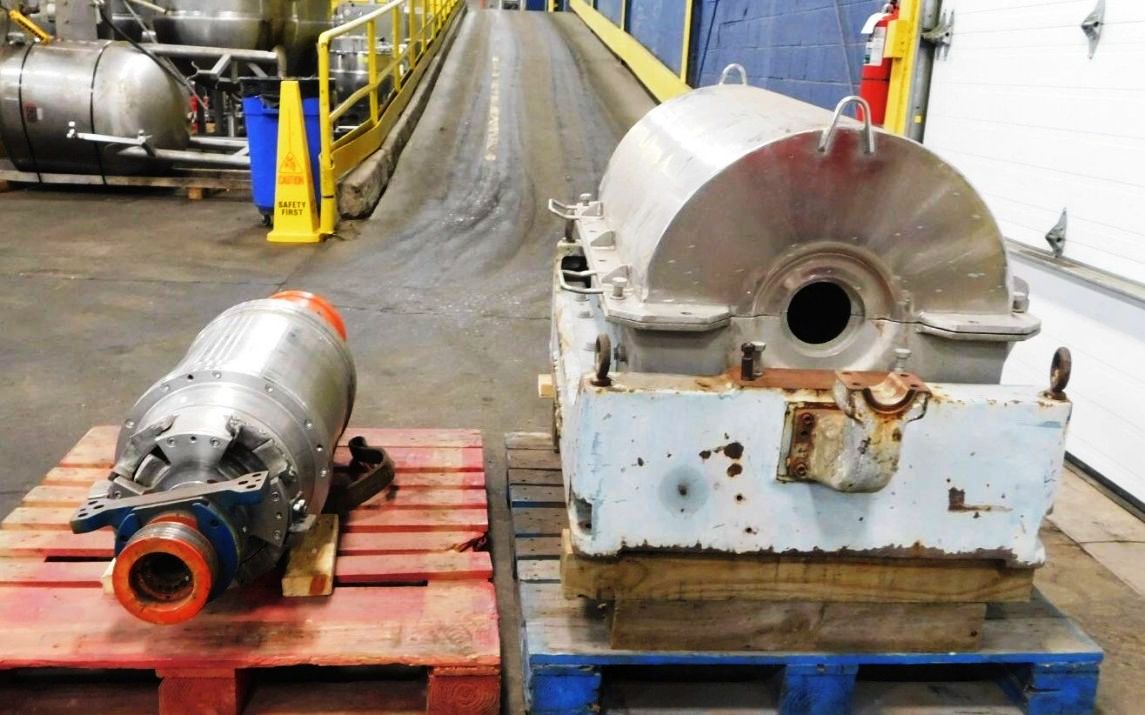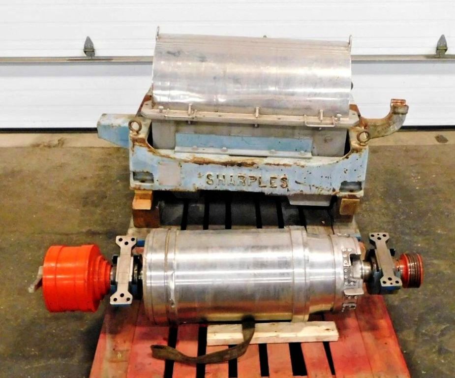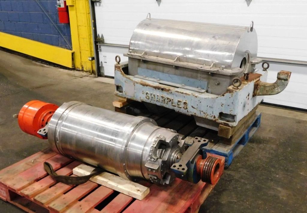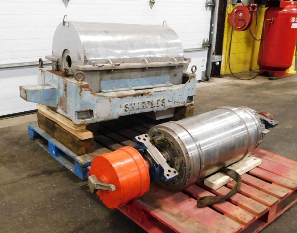 Max bowl speed 4000 RPM, 3180 x G, hogged-out cake ports, 3" single lead hardsurfaced conveyor, 125:1 gearbox, TA assembly, base, casing, pillow blocks and driven sheave. Reconditioned to "as new."