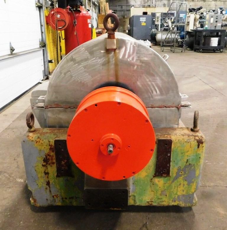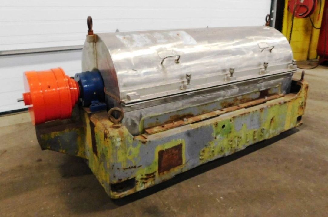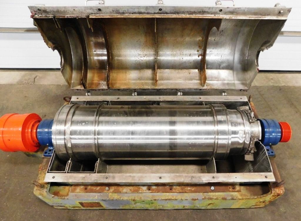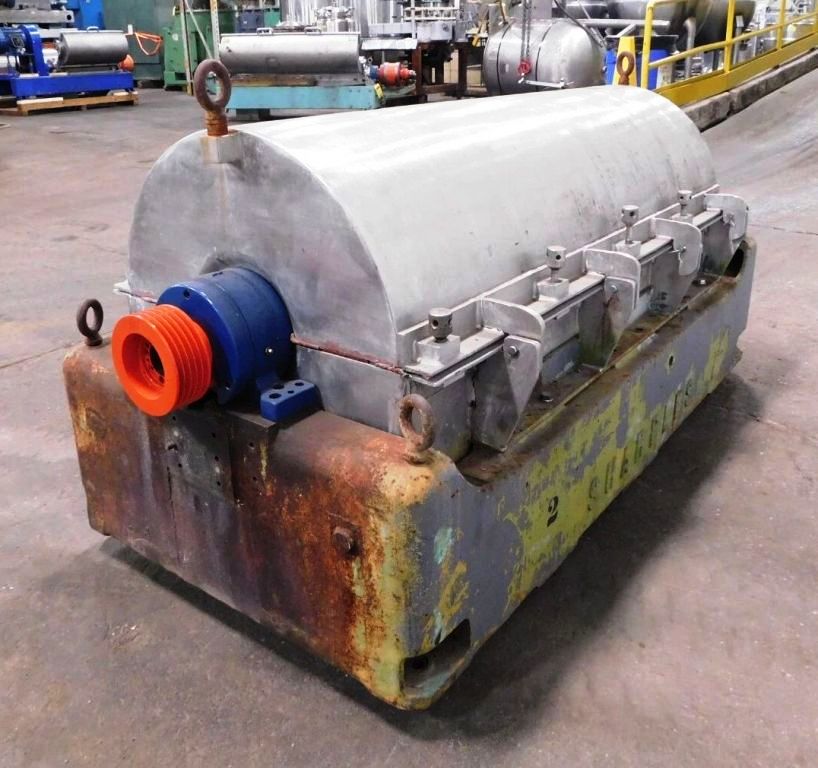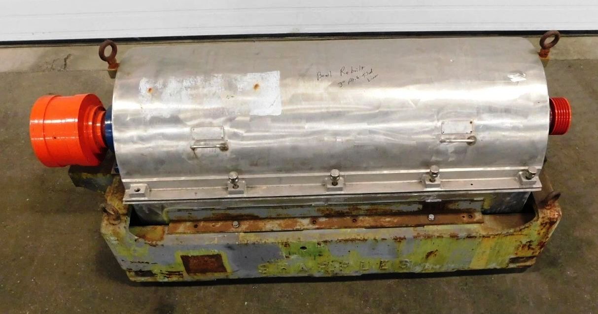 Max bowl speed 4000 RPM, 3180 x G, hogged-out cake ports, tiled beach, 3" single lead STC-tiled conveyor, 125:1 gearbox, base, casing, pillow blocks and driven sheave. Reconditioned to "as new."