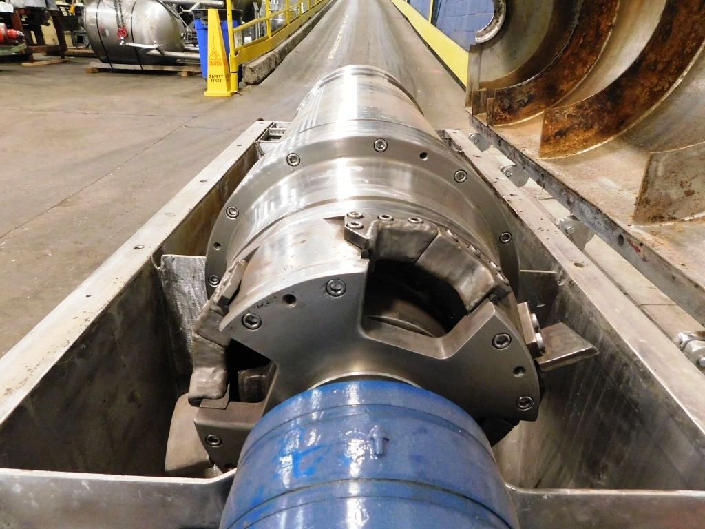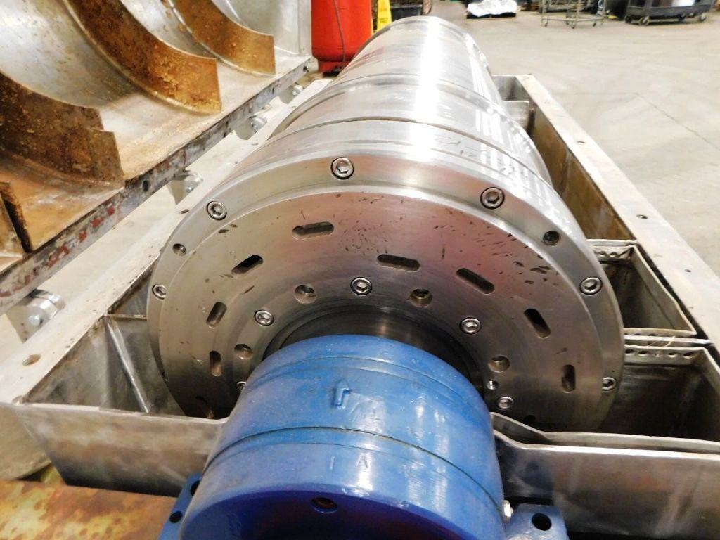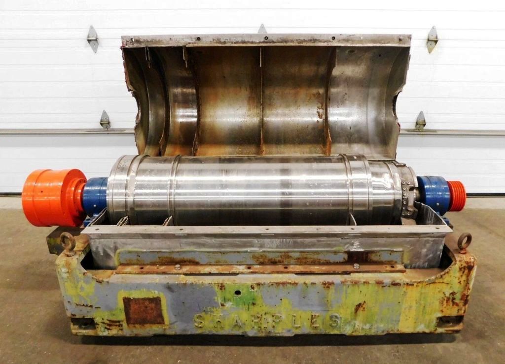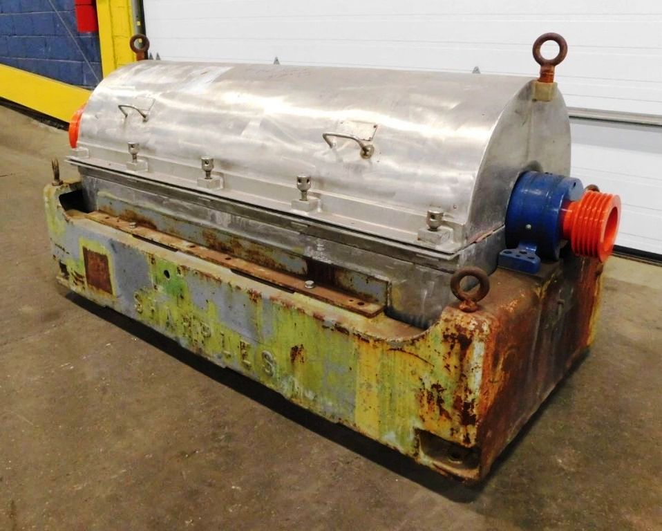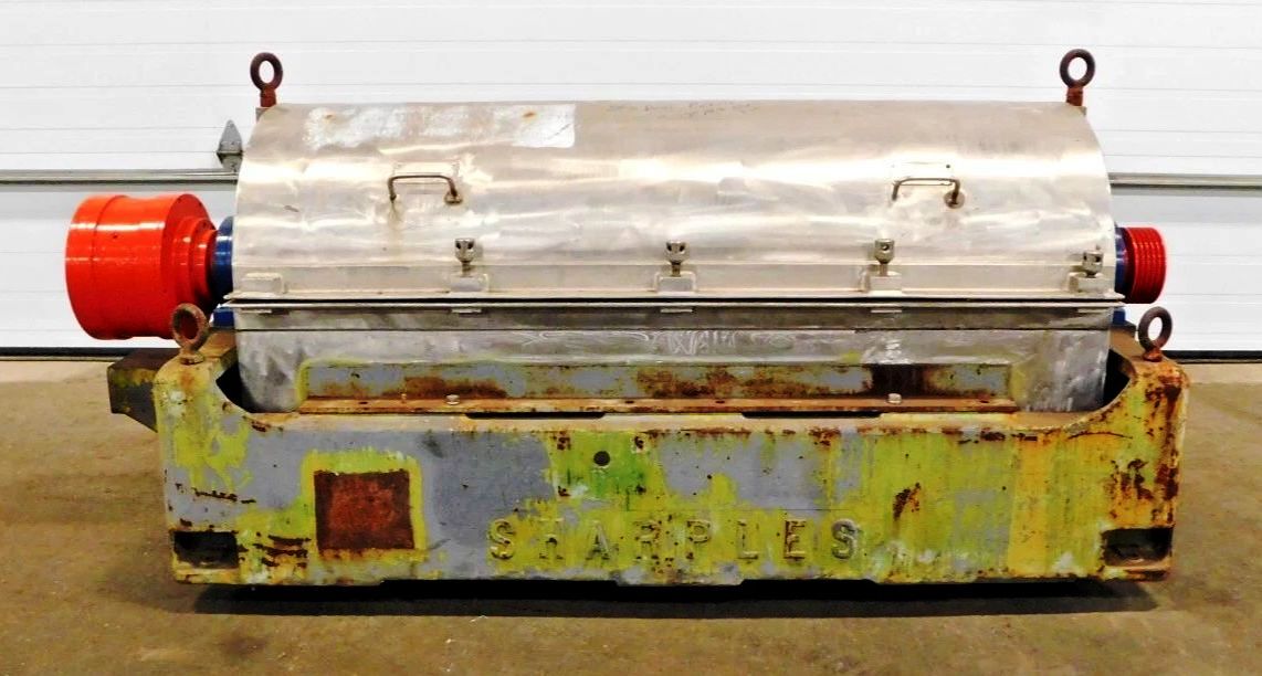 Max bowl speed 4000 RPM, 3180 x G, hogged-out cake ports, tiled beach, 3" single lead STC-tiled conveyor, 125:1 gearbox, base, casing, pillow blocks and driven sheave. Reconditioned to "as new."