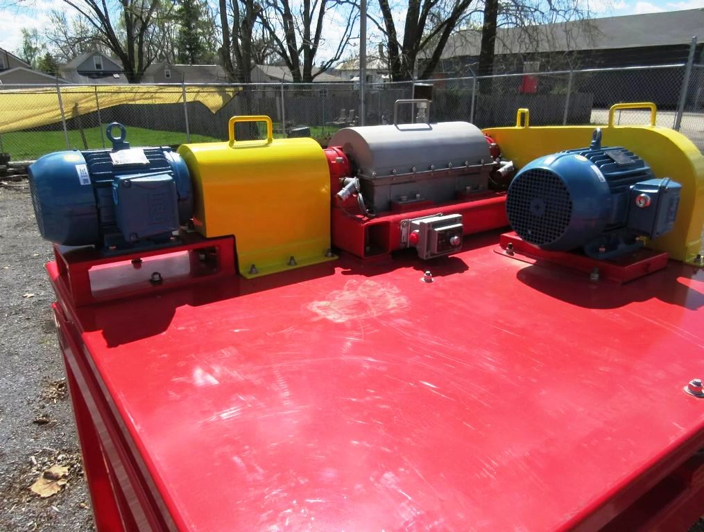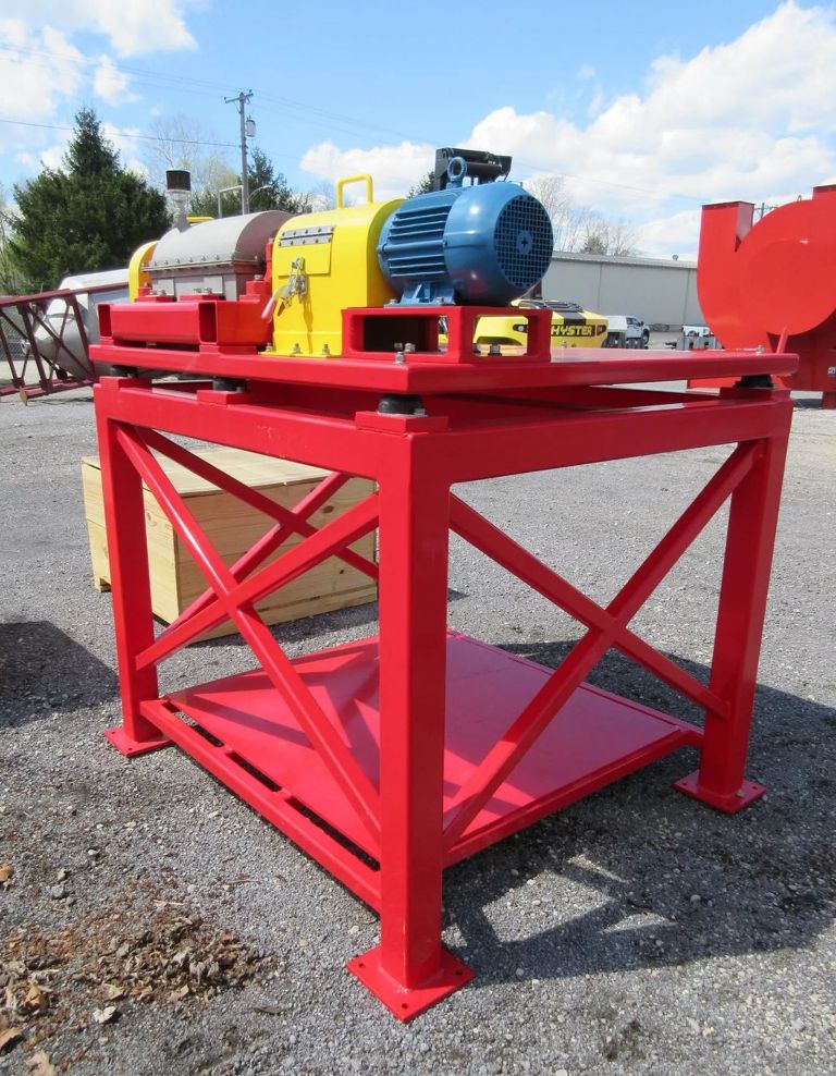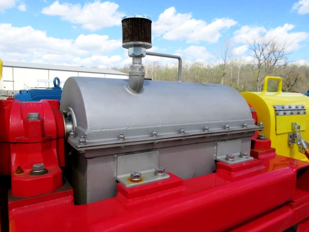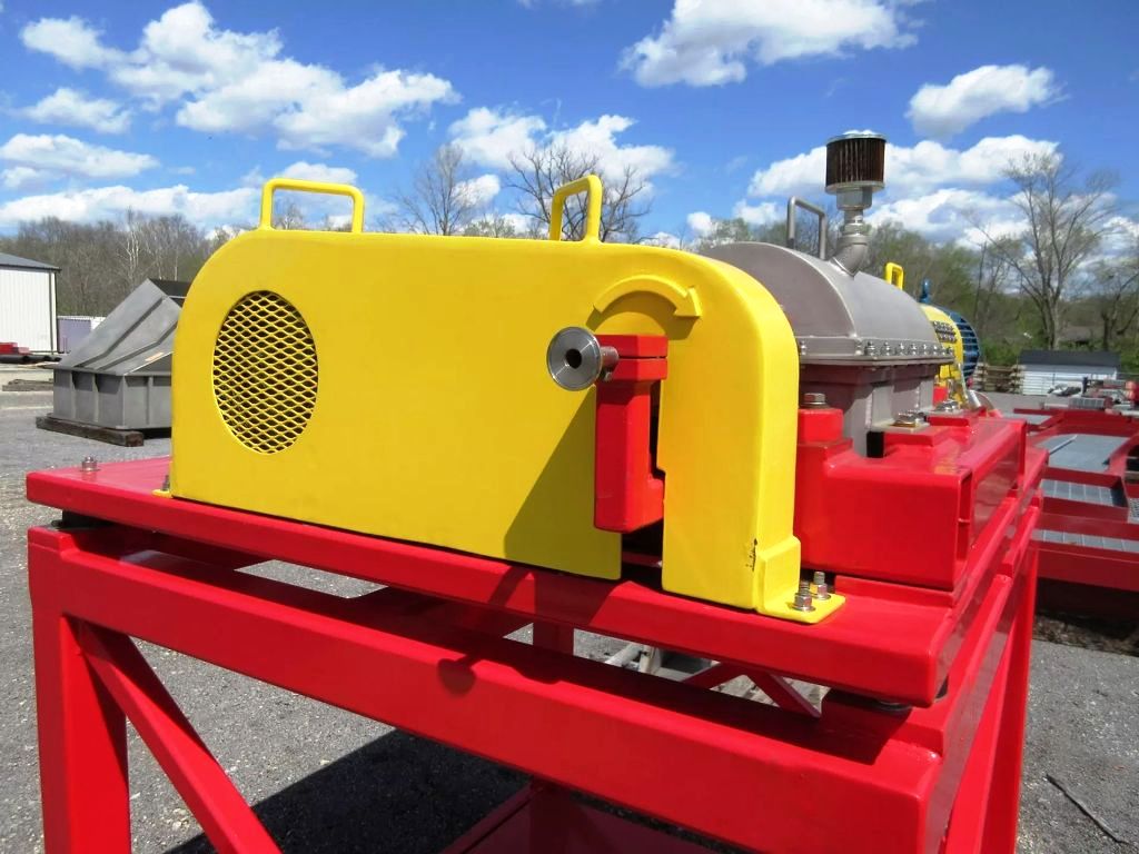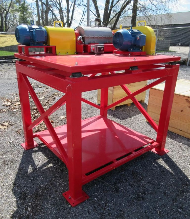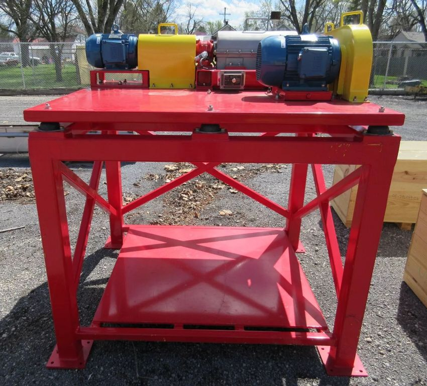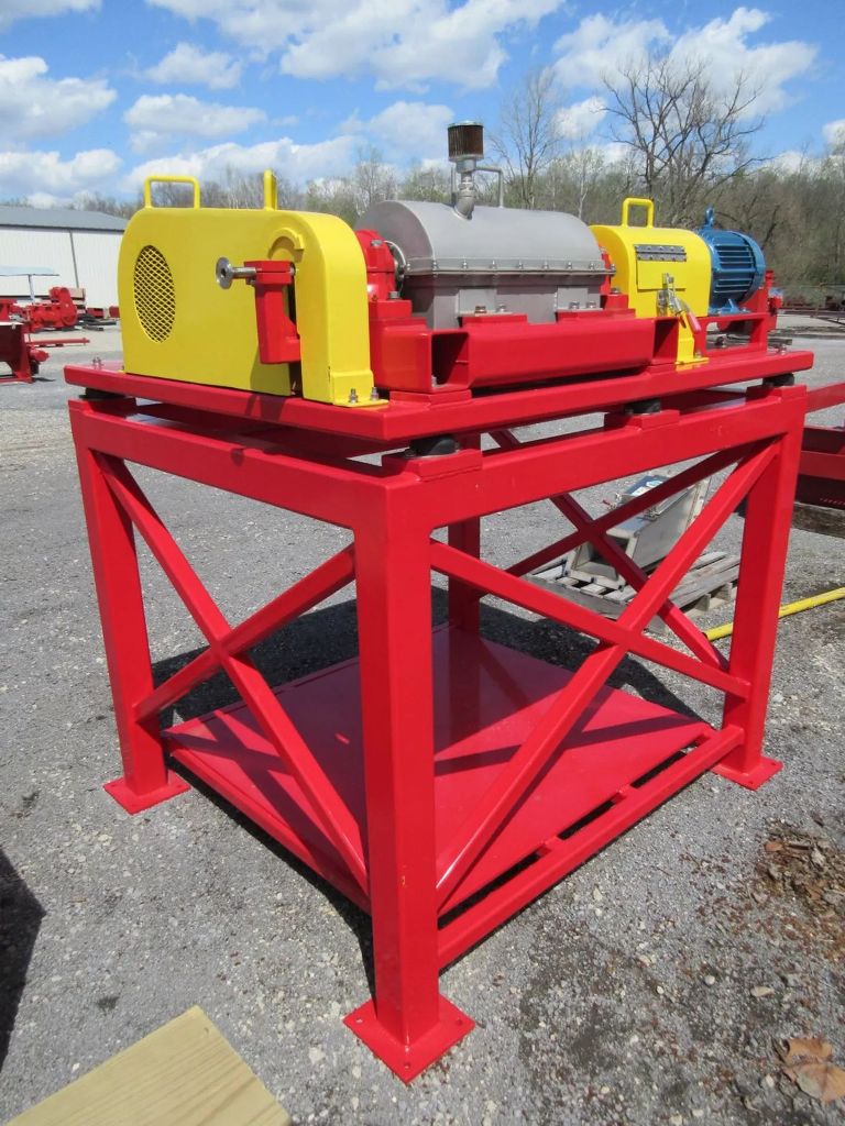 Max bowl speed 6000 RPM, 3070 x G, 2" single lead hardsurfaced conveyor, new 10 HP motor 230/460/3/60/3500 RPM, 95:1 gearbox, new 5 HP backdrive, feed tube, guards and chutes, unitized on a sub-base with vibration switch/isolators, mounted on a portable stand. Reconditioned and unused since.