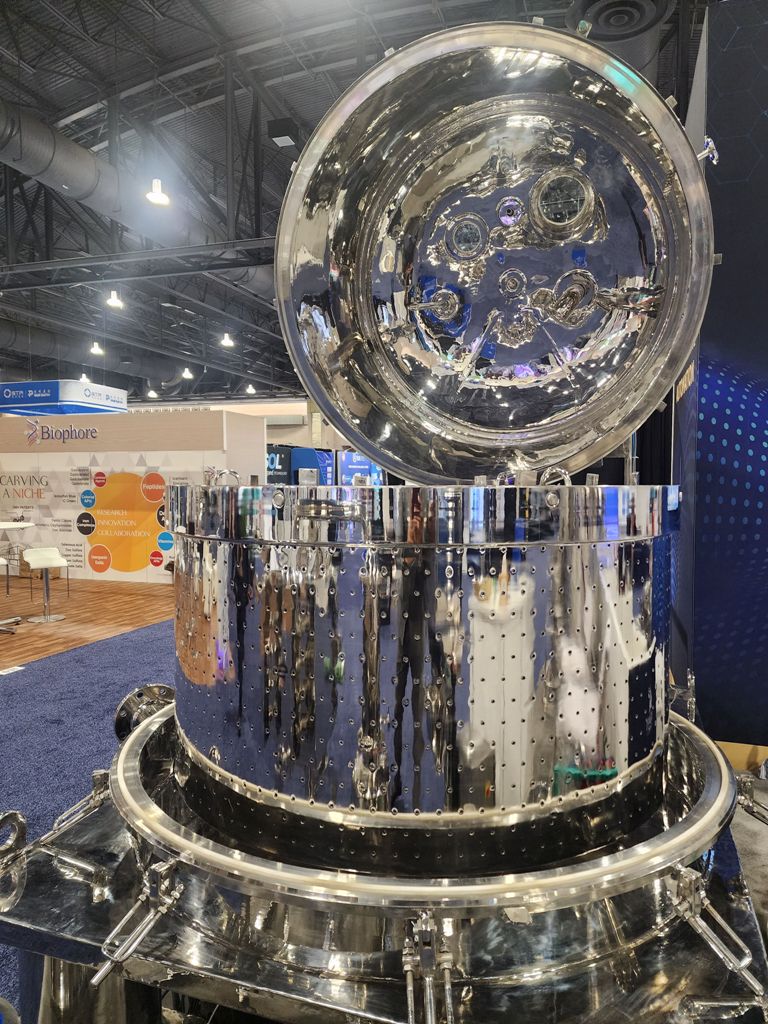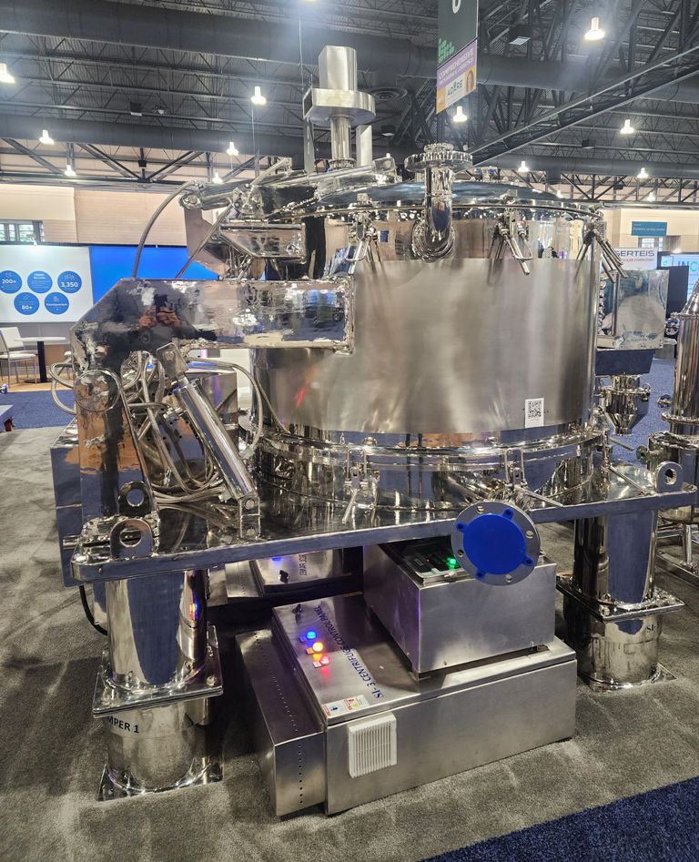 Max bowl speed 900 RPM, 541 x G, 1200 x 600mm basket ID, 330 L volume capacity, 2.6 sqM filtration area, max load 420 kg, top unload, flip-top and full body opening, mirror polished finish pharmaceutical cGMP CIP design, 22 KW motor 220/3/60/1800 RPM with VFD, feed and rinse pipes, sight glass and safety interlock, mounted on a stand with control panels. 2023 vintage. Brand new; never used.