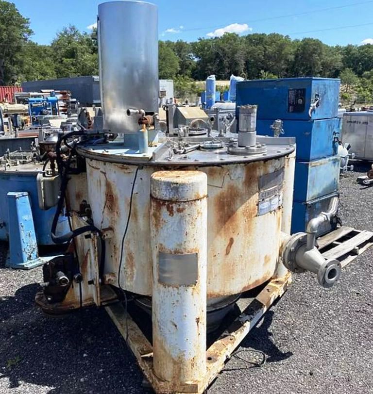 The Tolhurst 48 x 24 Batch-O-Matic perforate basket centrifuge, 316L SS. is engineered for high-efficiency separation processes in various industrial applications. With a maximum bowl speed of 1080 RPM and capable of generating up to 900 x G, this centrifuge is designed to handle significant volumes of material while ensuring optimal separation of solids from liquids. The bottom dump feature allows for easy and efficient discharge of processed materials, while the integrated plow system enhances the mixing and movement of materials within the basket, ensuring uniform processing and improved product quality. The Oilgear hydraulic drive system, paired with a robust 30 HP motor, ensures reliable operation and consistent performance across a range of applications, making it an ideal choice for industries such as food processing, pharmaceuticals, and chemical manufacturing.