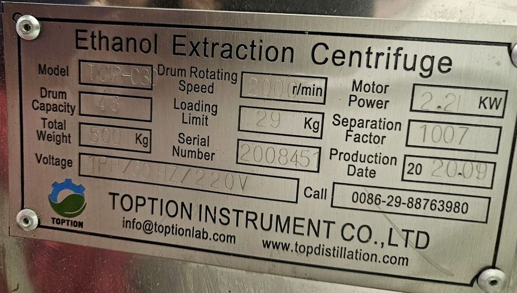The Toption TOP-C30 ethanol extractor, 316L SS. is engineered to deliver exceptional performance in the extraction of essential oils and cannabinoids from various biomass sources. With a maximum bowl speed of 2000 RPM and a centrifugal force of 1007 x G, this extractor is capable of processing up to 29 kg of biomass per batch, making it an ideal choice for medium to large-scale operations. The 48-liter capacity allows for efficient extraction cycles, while the low-temperature capability of -80°C ensures that delicate compounds are preserved during the extraction process. This feature is particularly important for applications where the integrity of the extracted material is paramount, such as in the production of high-quality cannabis oils or botanical extracts.