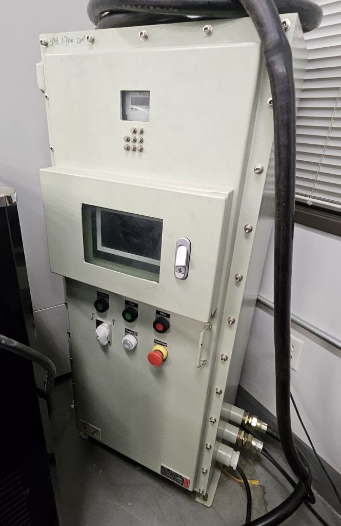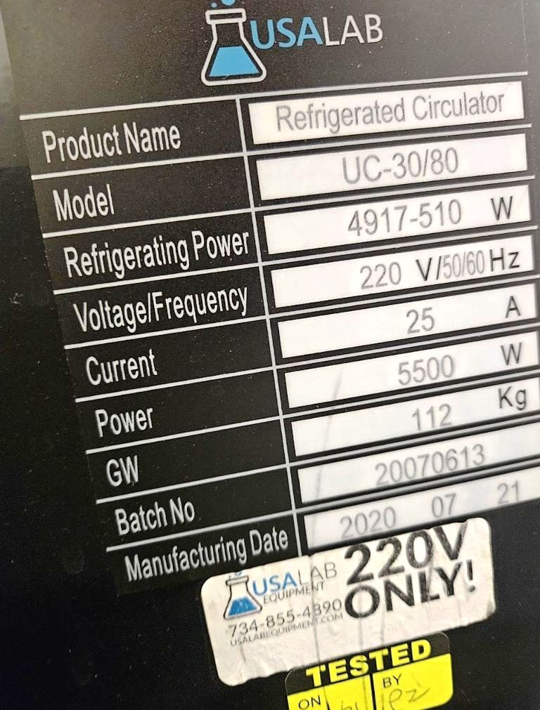 Max bowl speed 2000 RPM, 1007 x G, rated @ 29 kg biomass per batch, 48 L capacity, low temp -80C max, sanitary design, vacuum jacketed insulation layer, 2.2 KW XP motor 220/1/60, reinforced sight glass, tri-clamp fittings for feed and drain ports, skid-mounted with vibration isolators, PLC control panel with VFD and USA LAB UC-30/80 Chiller. 2009/2020 vintage. Excellent condition.