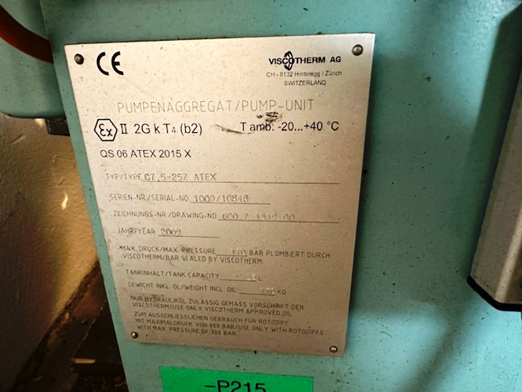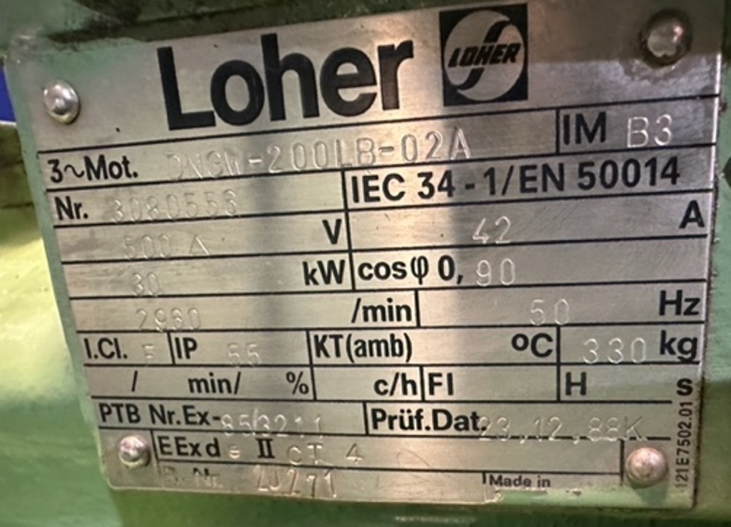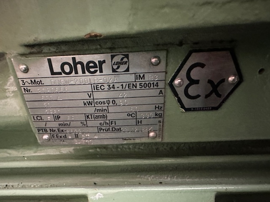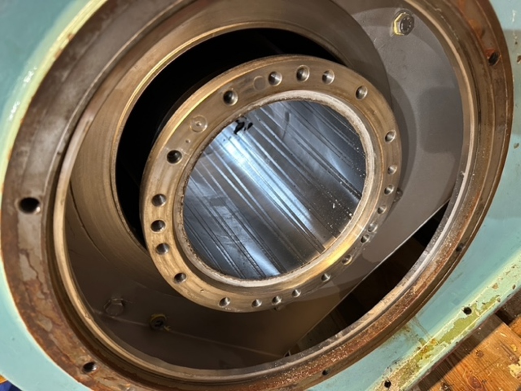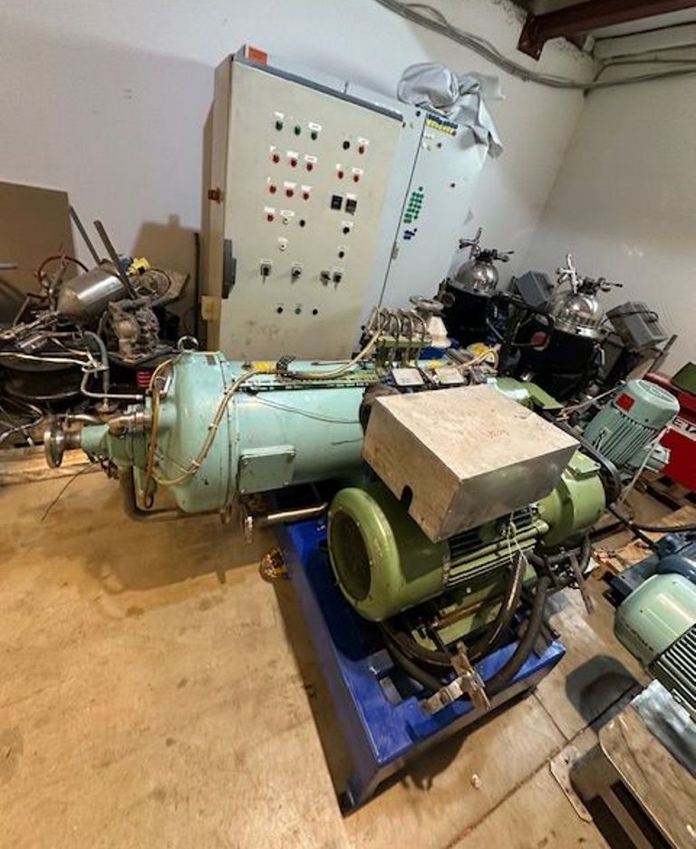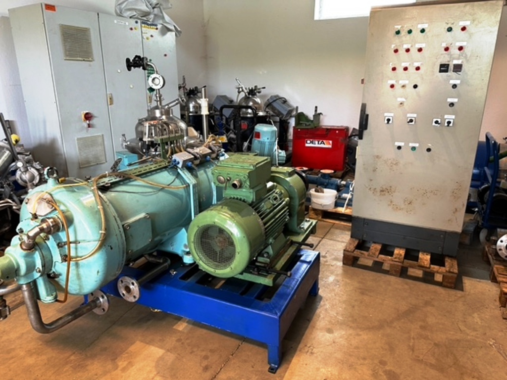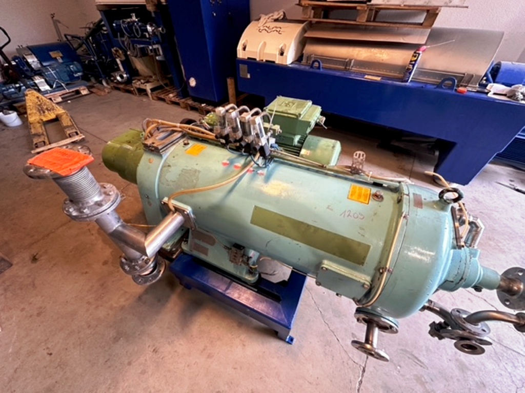 Max bowl speed 4000 RPM, 3180 x G, 8 degree beach angle, effluent discharged under pressure, 110mm single lead hardsurfaced conveyor, 30 KW XP motor 600/3/50/2980 RPM, Viscotherm ATEX hydraulic backdrive system, lube system, guards, feed tube, vibration isolators/switch and chutes, mounted on a stand with control panel. 1989 vintage. Reconditioned. Located in Europe.