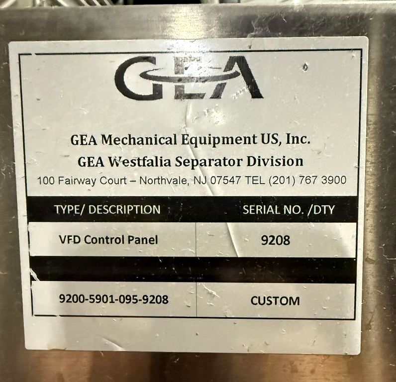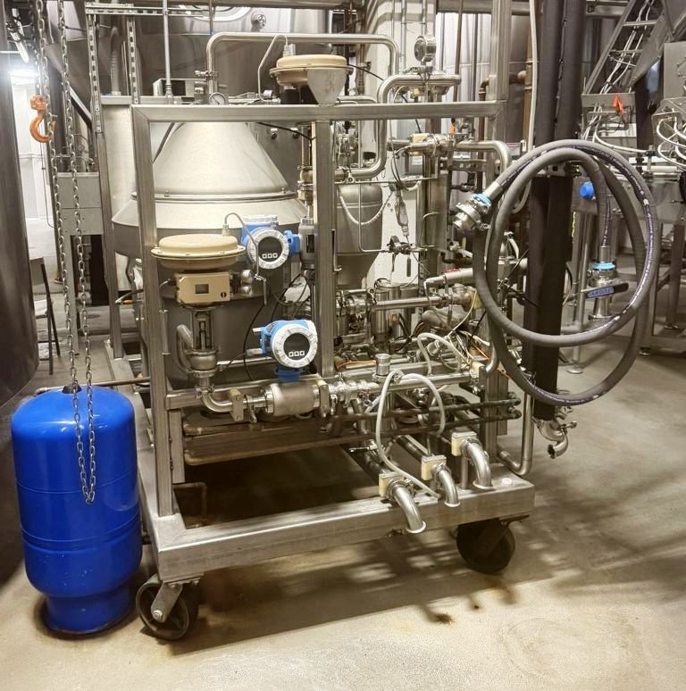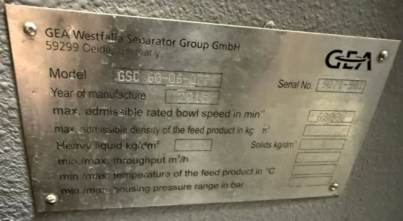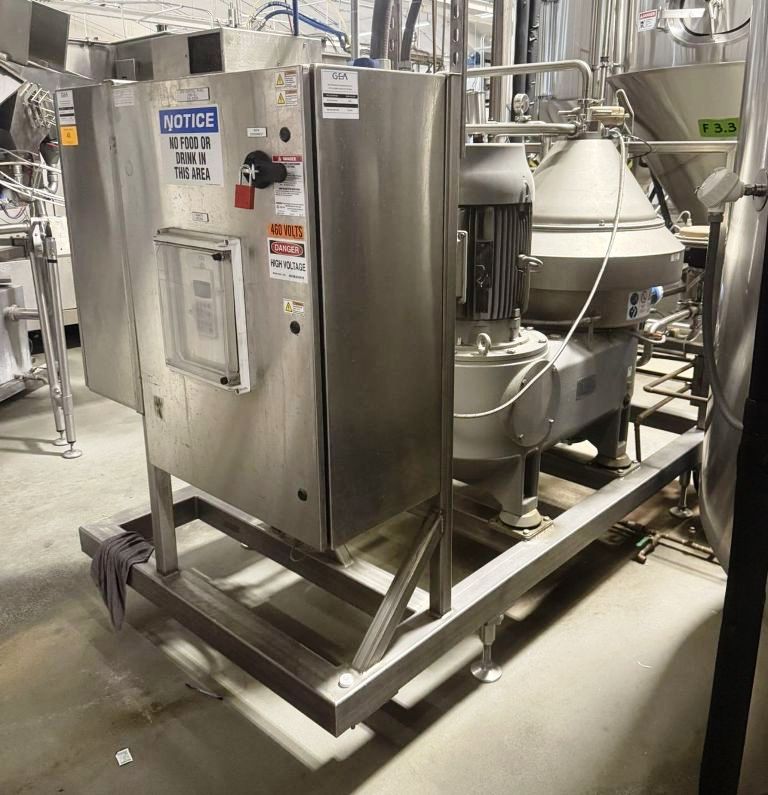 Max bowl speed 6800 RPM, rated @ 26,000 LPH, 8.5 L solids capacity, 6 bar. 30 KW motor 380/660/3/50/1470 RPM, flow meter, valves, hydro cyclone, mono sludge pump, Allen Bradley PLC control panel with PanelView 1000 Color Touch Screen HMI and tools, unitized on a skid. Prior use: Brewery. 2015 vintage. Excellent condition.