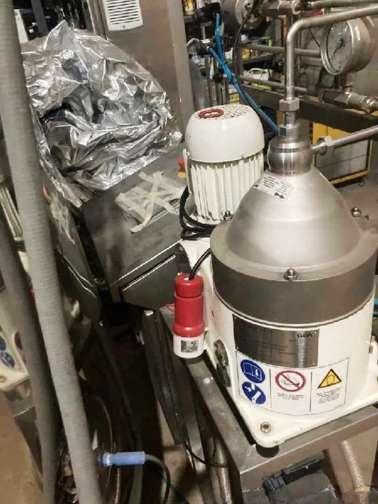 Max bowl speed 10,080 RPM, 9500 x G, rated @ 20-50 LPH, solids space 0.5 L, bowl volume 1 L, hydrohermetic product feed, liquid discharged via centripetal pump, 4.8 KW motor 380/460/3/50/60 with cord, water harness, feed pump, piping, guages, PLC/HMI control panel with VFD, unitized on a SS skid with tools and manual. 2019 vintage. Suitable for yeast separation. Barely used; like new. Located in South America.