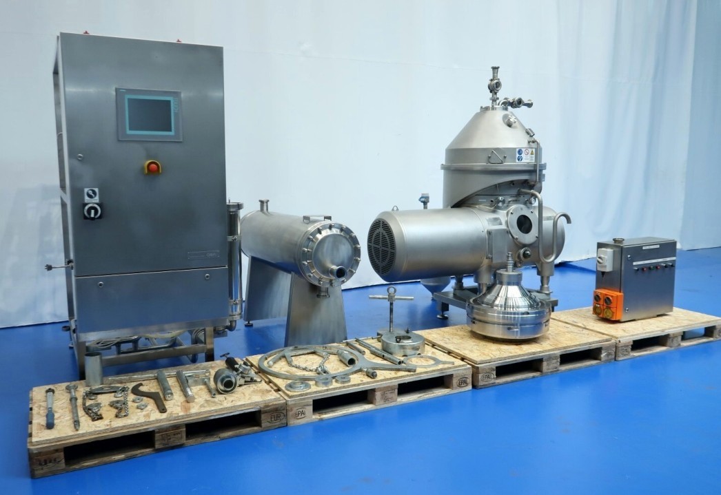 Max bowl speed 5350 RPM, rated @ 1500 kg/hr, 3300 PPH, SS motor and base. 20 KW motor 380/3/50/2905 RPM, 0.75 KW scraper blade motor, scraper, manometer, counter pressure valve, flow meter and control panel. Very good condition. Located in Europe.