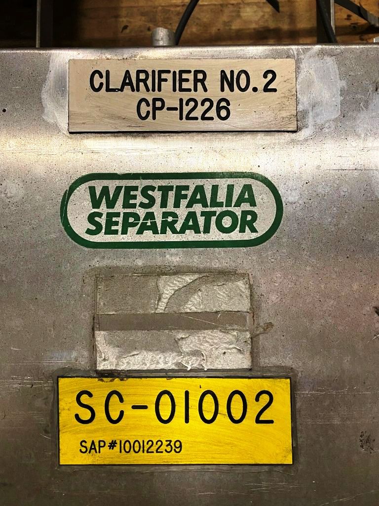 Max bowl speed 4700 RPM, rated @ 35,000 LPH. 50 HP motor 460/3/60/1775 RPM, sludge tank, feed valve, pressure gauge, flow meter and control panel. 1991 vintage. Very good condition.