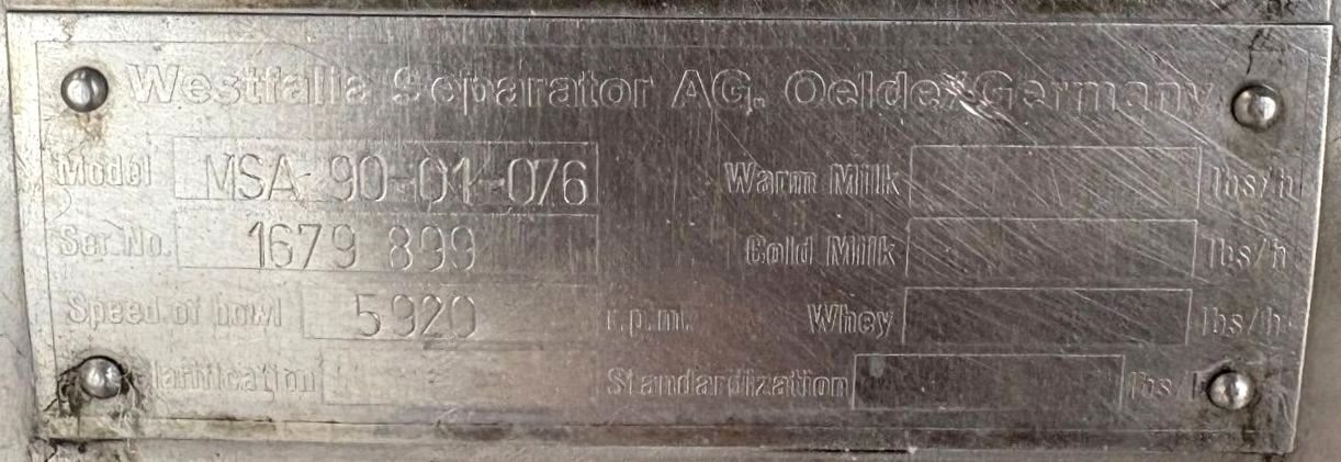 The Westfalia MSA 90-01-076 milk separator, 316SS. is engineered for high efficiency and reliability in the dairy processing industry. With a maximum bowl speed of 5920 RPM, this separator is capable of handling up to 10,000 liters per hour of hot milk, making it an ideal choice for large-scale operations. The robust 30 HP motor, operating at 460 volts, 3-phase, and 60 Hz, ensures consistent performance while maintaining energy efficiency. The pneumatic milk counter pressure valve allows for precise control over the separation process, enhancing product quality and consistency. Additionally, the integrated flow indicator provides real-time monitoring of the milk flow, ensuring optimal operational efficiency and minimizing downtime during production runs.