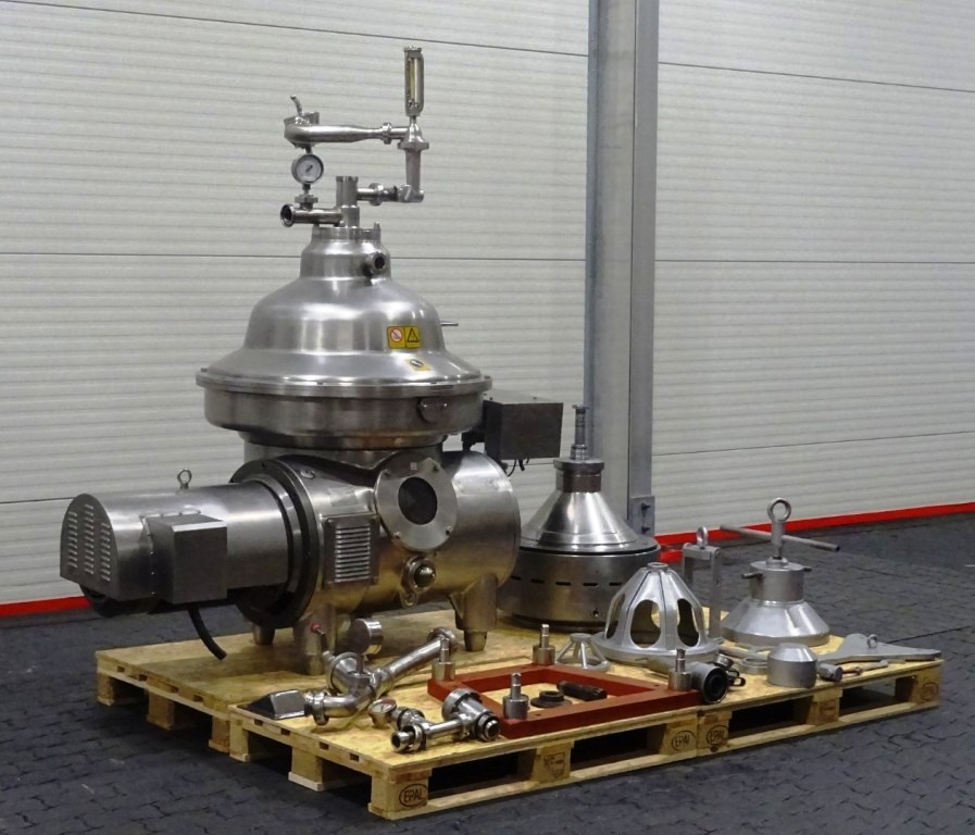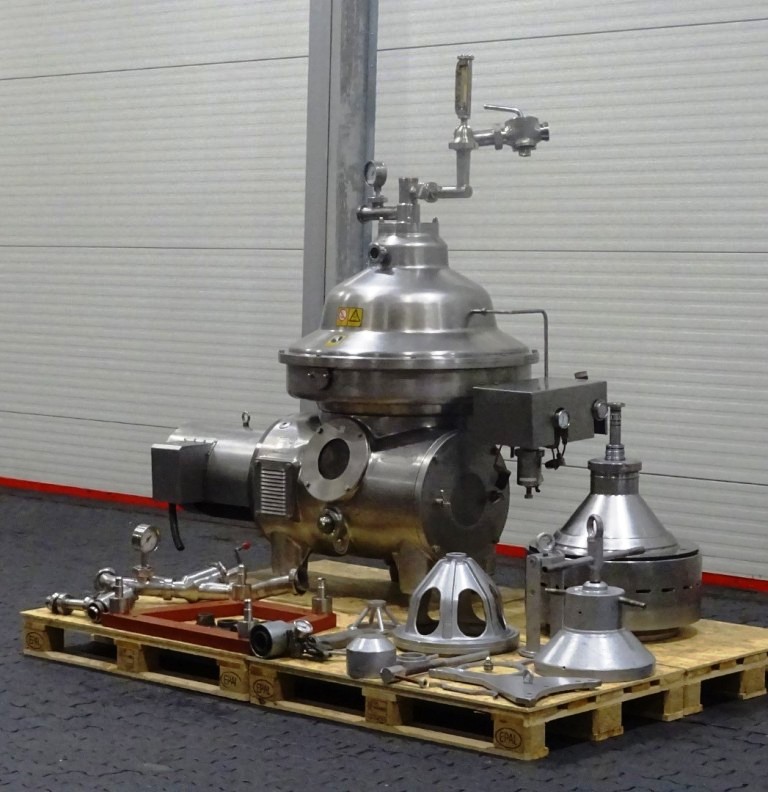 Max bowl speed 5920 RPM, rated @ 15,000 LPH for skimming, 22,500 LPH for milk cleaning or standardization, 30 KW motor 200/3/50/60, water valves, all inlet/outlet pipes with pumps, flow indicators, sample valves, base plate with feet, tools and manual. 1996 vintage. Very good condition. Located in Europe.
