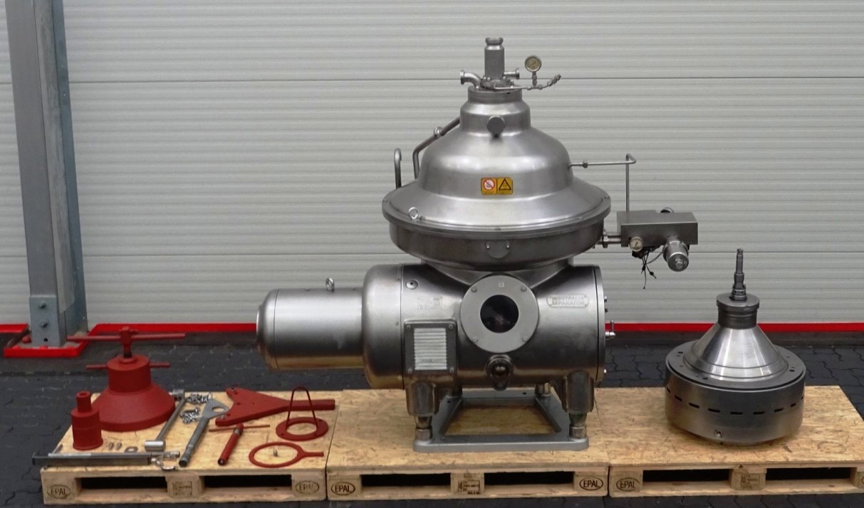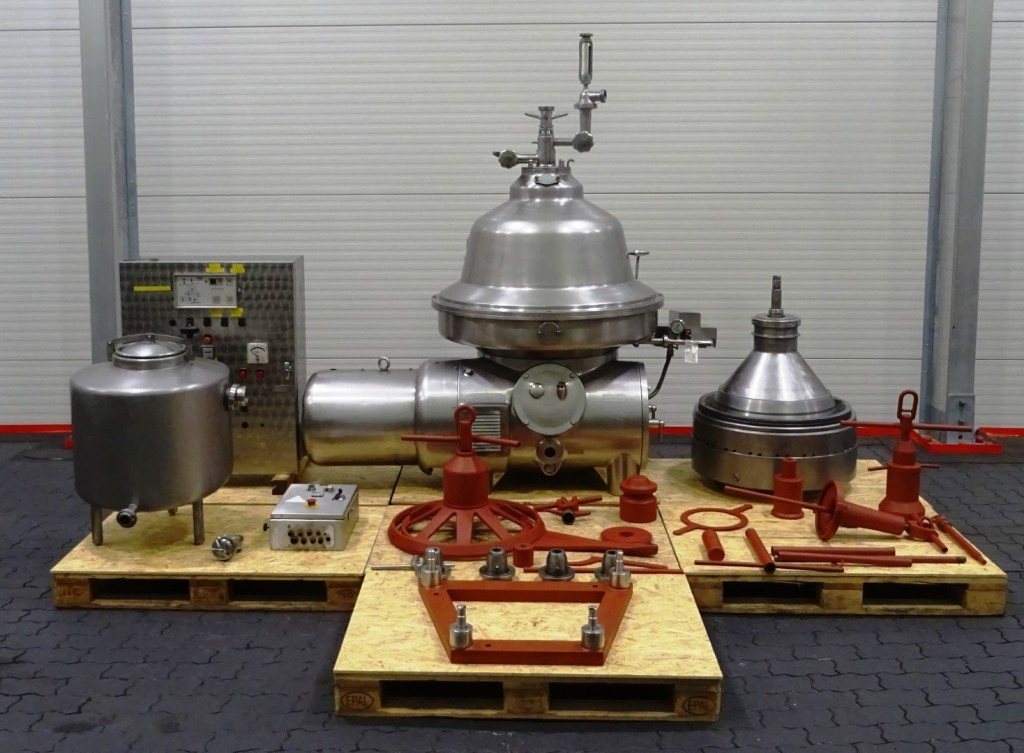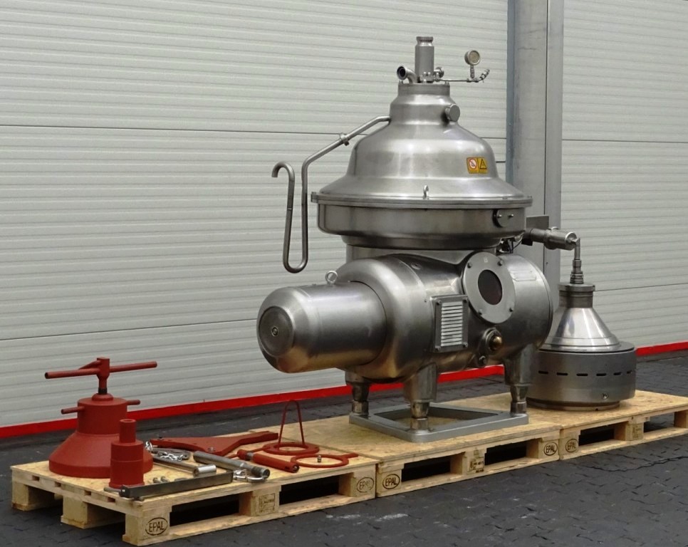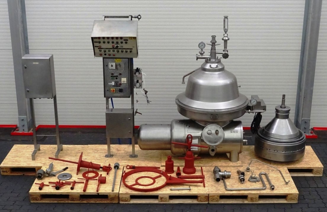 Max bowl speed 5920 RPM, rated @ 15,000 LPH. Special design with hermetic cream outlet (no pump) for cold skimming, therefore the cream is discharged without damaging the fat globules, even at low temperatures. 26 KW motor 380/3/60/1750 RPM, water valves, constant pressure valve 3 bar, monometer on outlet, base frame and tools. 1992 vintage. Excellent condition. Located in Europe.