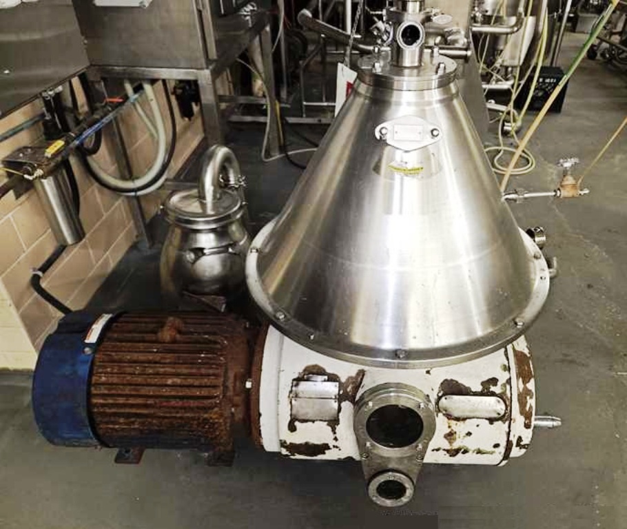 Bowl speed 6500 RPM, rated @ 10,500 LPH milk standardization/cleaning/whey skimming, 7000 LPH milk skimming, 11 KW motor 575/3/60/1770 RPM, inlet/outlet piping, tools and control panels. 1983 vintage. Very good condition. Located in Canada.