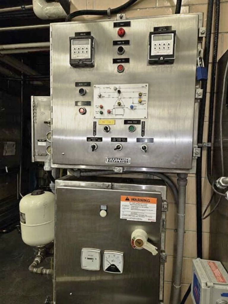 The Westfalia MSD 60-01-076 milk separator, 316SS. is engineered for high efficiency and reliability in the dairy processing industry. With a bowl speed of 6500 RPM, this separator is capable of handling substantial volumes of milk, achieving a remarkable throughput of 10,500 liters per hour for milk standardization, cleaning, and whey skimming. For operations focused solely on milk skimming, the unit can efficiently process up to 7000 liters per hour. This impressive performance is powered by an 11 kW motor, designed to operate at 575 volts, 3-phase, and 60 Hz, ensuring optimal energy consumption while maintaining high output. The separator is equipped with inlet and outlet piping, as well as necessary tools and control panels, making it a comprehensive solution for your dairy processing needs.