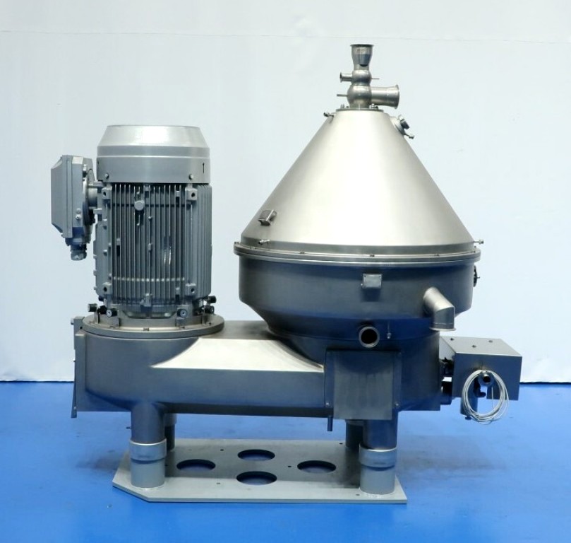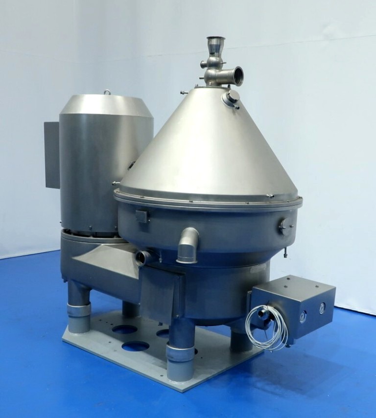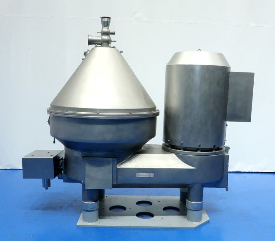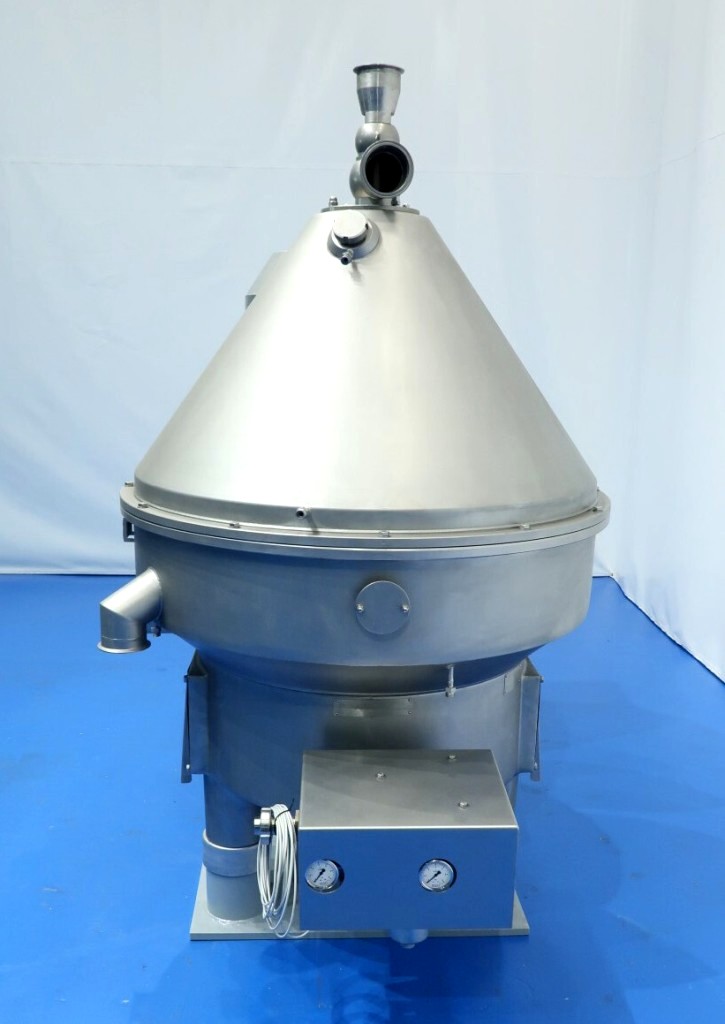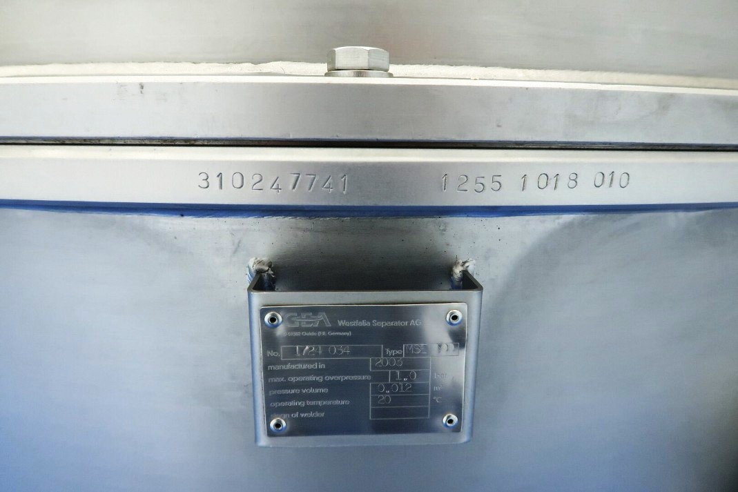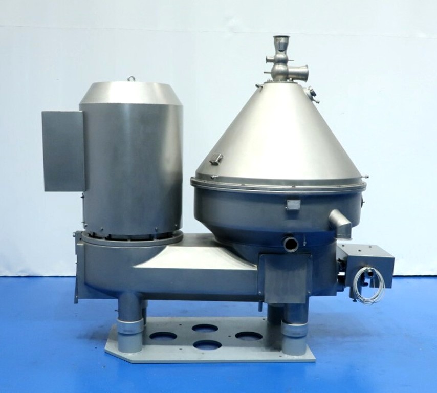 The Westfalia MSE 500-01-177 warm milk/whey skimmer, 316SS. is designed for high efficiency in the dairy processing industry, particularly for the separation of cream from milk and whey. With a maximum bowl speed of 4800 RPM, this skimmer is capable of handling a remarkable throughput of 113,500 PPH or 50,000 LPH, making it an ideal solution for medium to large-scale operations. The solids space of 21 liters allows for effective separation while maintaining optimal flow rates. The unit operates at a feed pressure of 6 bar, ensuring that the milk and cream are discharged under pressure via reliable centripetal pumps, which enhances the efficiency of the skimming process. The hydro-hermetically sealed feed and discharge systems minimize the risk of contamination, ensuring that the final product meets the highest quality standards.