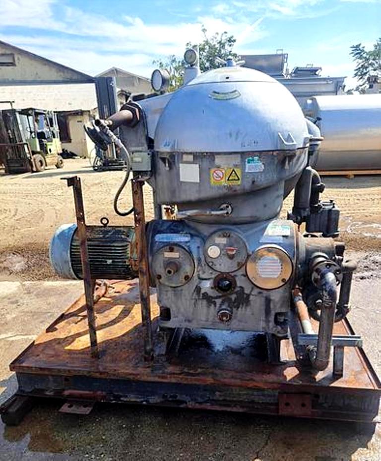 Max bowl speed 6600 RPM, rated @ 12,300 LPH, oil discharge under pressure, 15.7 KW XP motor 440/3/60/1755 RPM and feed pump on skid. No controls or tools. 1982 vintage. Very good condition.