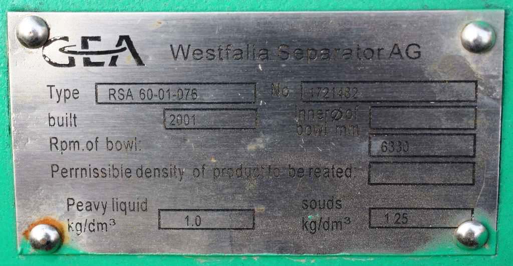 Constructed from high-quality 316 stainless steel, the Westfalia RSA 60-01-076 is not only durable but also resistant to corrosion, making it suitable for handling various types of vegetable oils. The stainless steel construction is particularly advantageous in food processing environments, where hygiene and cleanliness are paramount. This separator is designed to withstand the rigors of continuous operation, ensuring that it remains a valuable asset in your production line. Additionally, the base frame provides stability and ease of installation, allowing for straightforward integration into existing systems. Whether you are involved in the production of biodiesel or the refinement of edible oils, this separator is tailored to meet the specific needs of your industry.
