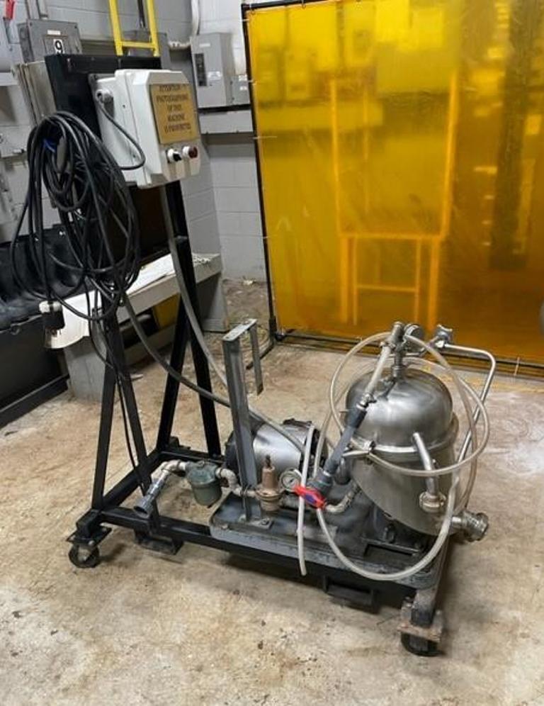 Max bowl speed 9470 RPM, rated @ 100 GPH, light liquid phase discharged under pressure, 2 HP motor 230/3/60/1750 RPM, control panel, tools and manual, unitized on a portable cart. Very good condition.
