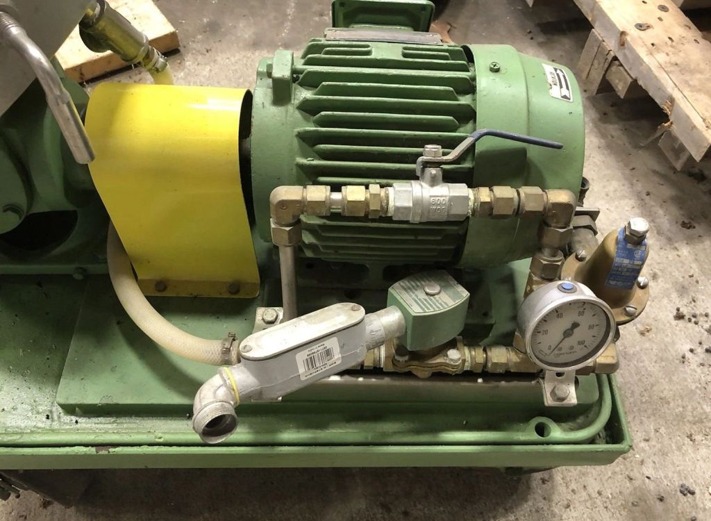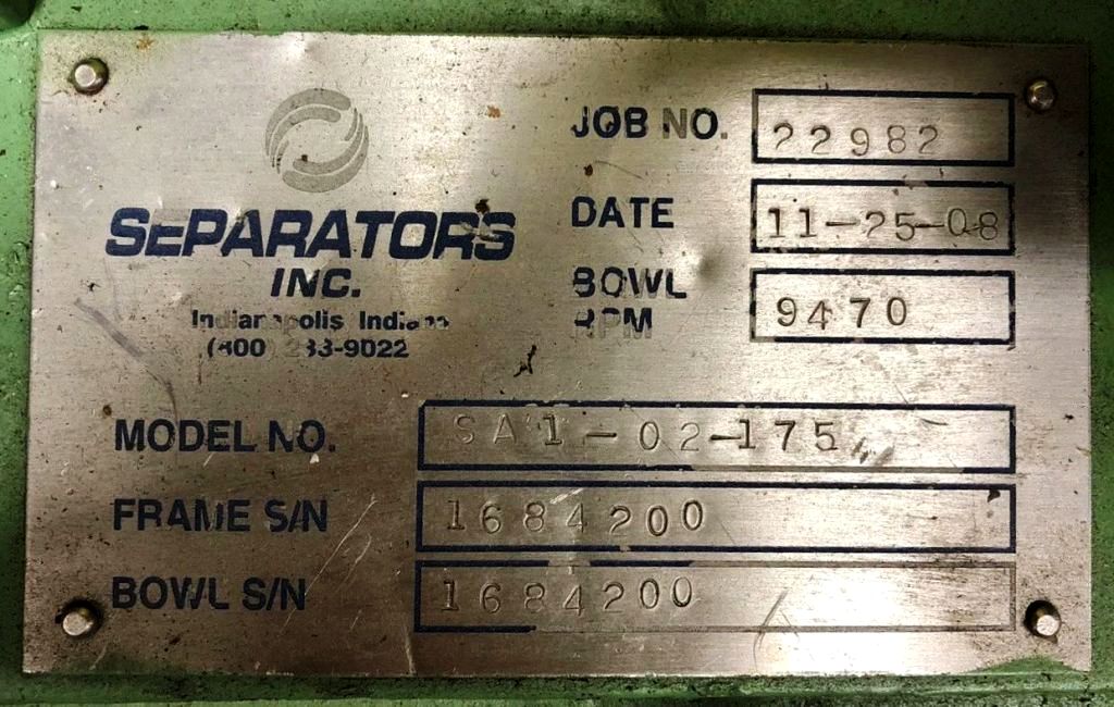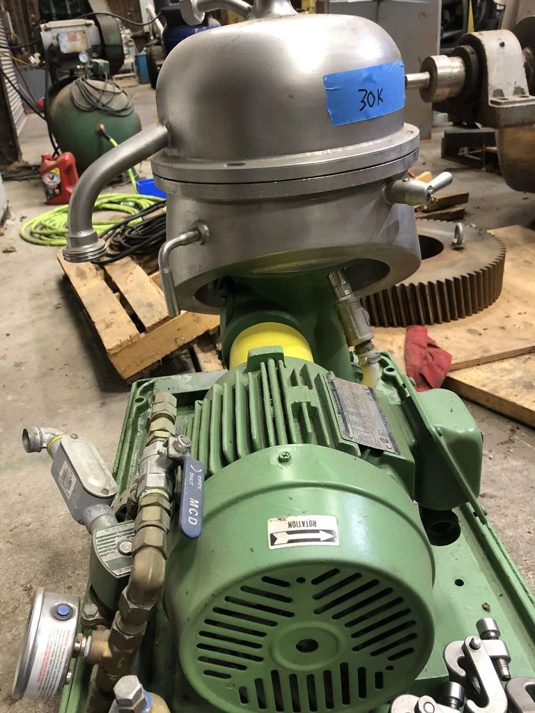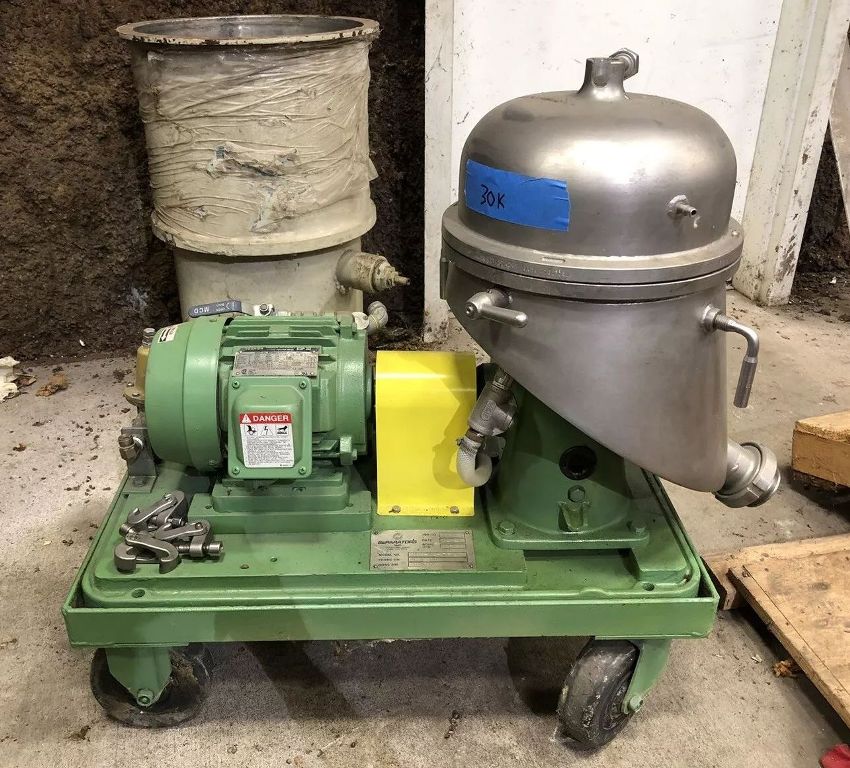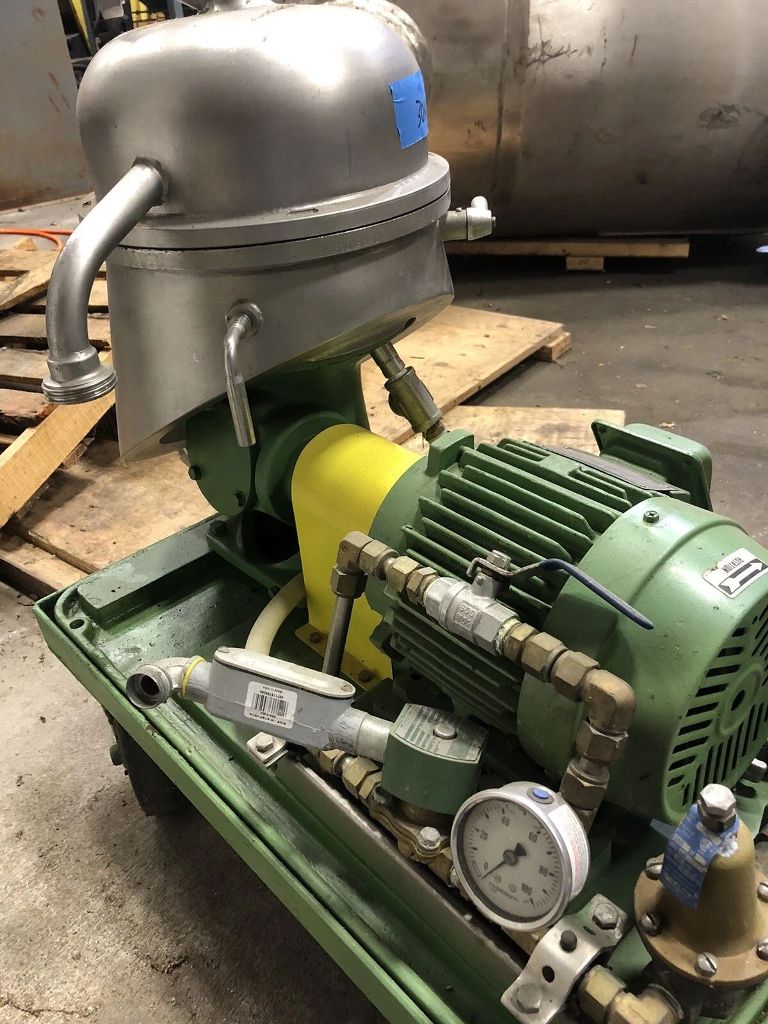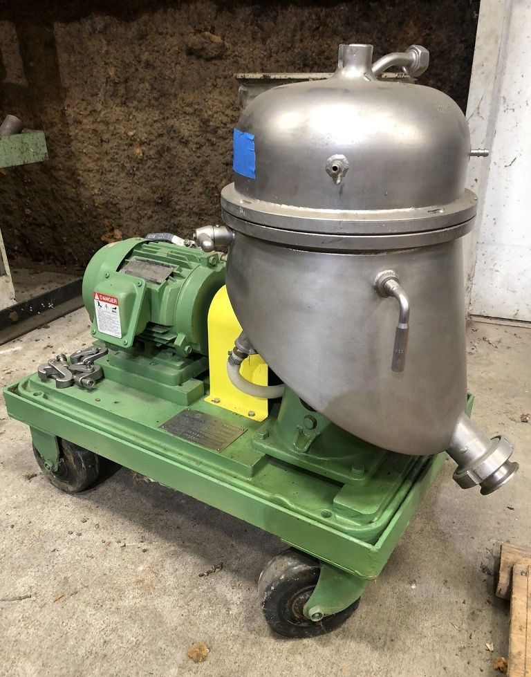 Max bowl speed 9470 RPM, rated @ 100 GPH, light liquid phase discharged under pressure, 1.5 HP motor 230/460/3/60/1750 RPM, mounted on a portable cart. Excellent condition.