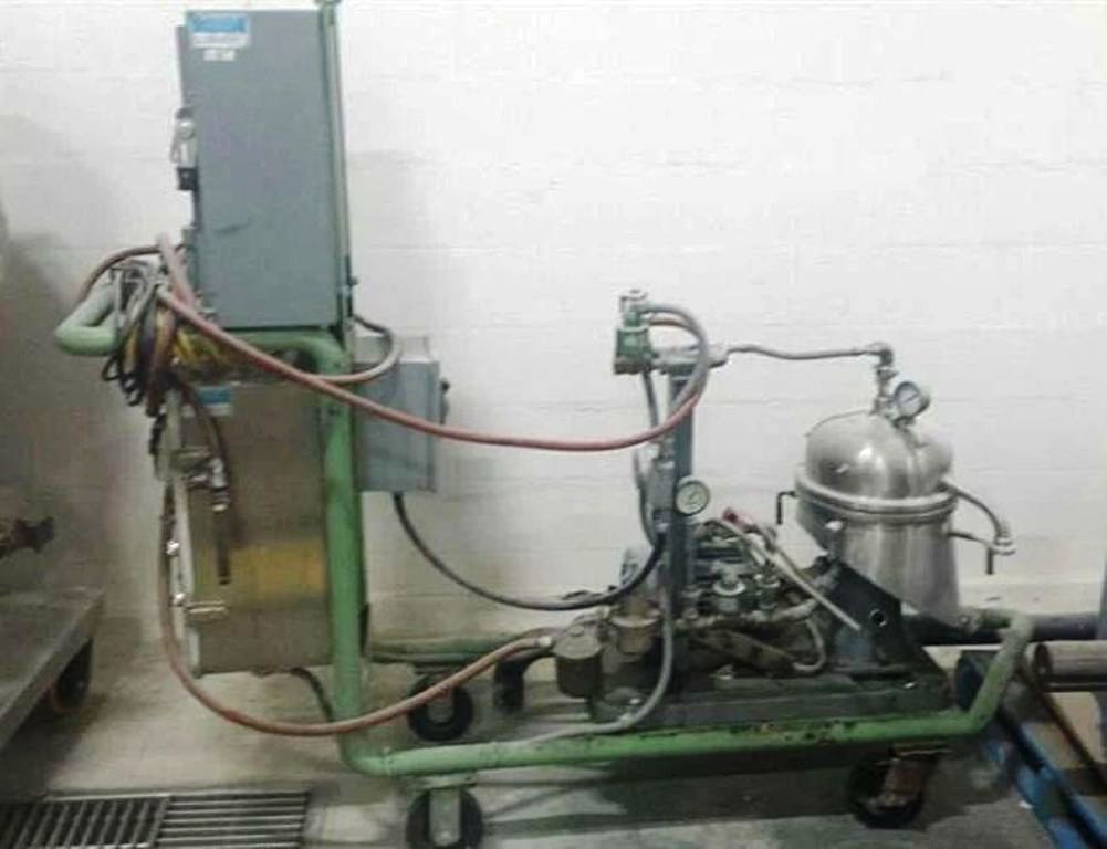 Max bowl speed 9470 RPM, rated @ 100 GPH, light liquid phase discharged under pressure, 2 HP motor 230/3/60/1750 RPM, control panel, tools and manual, unitized on a portable cart. Very good condition. Located in Canada.