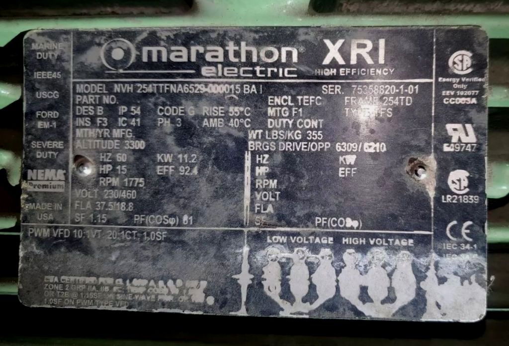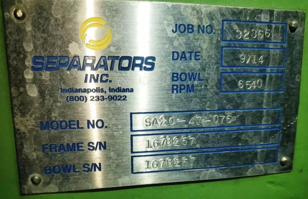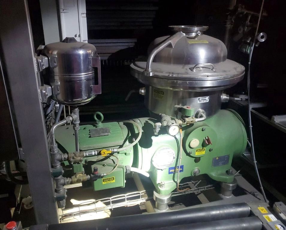 Max bowl speed 6540 RPM, rated @ 10,000 LPH, 15 HP motor 230/460/3/60/1775 RPM, water harness, vibration isolators, tools and control panel, mounted on a portable skid. Very good condition.