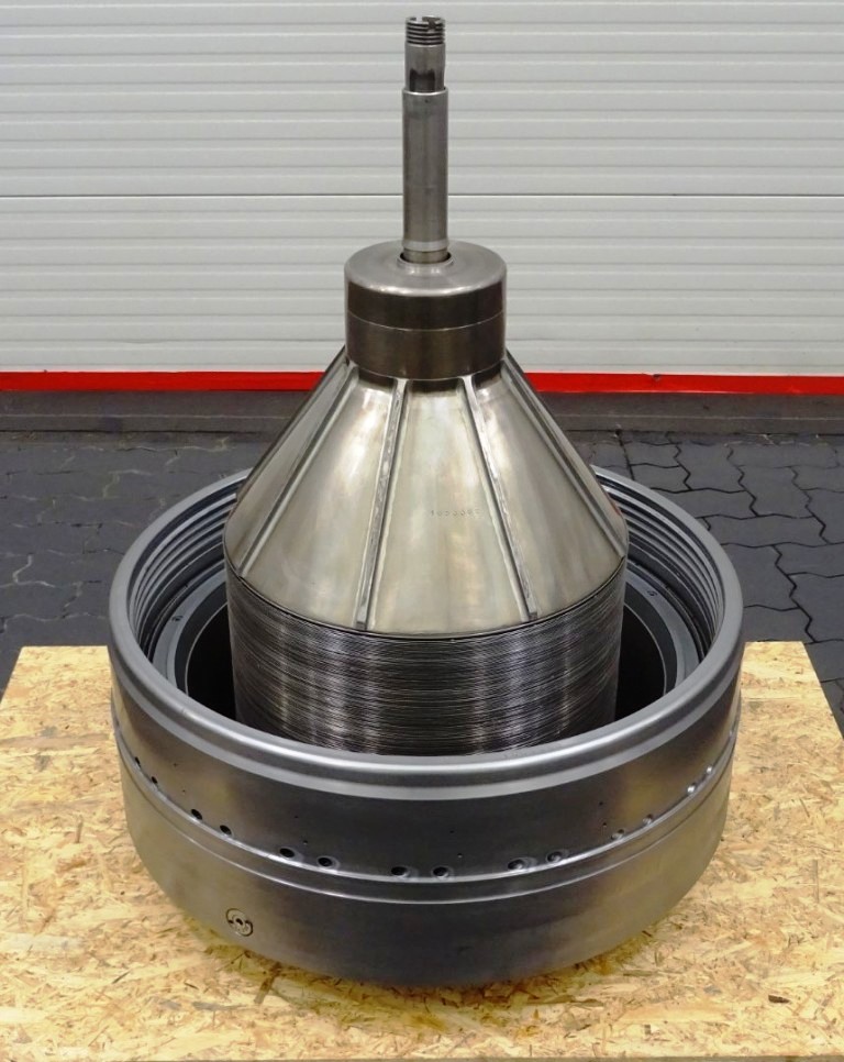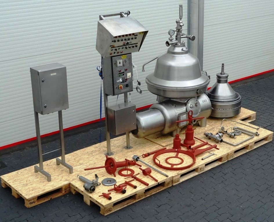 Max bowl speed 4700 RPM, rated @ 22,000 LPH on milk or whey. 30 KW motor 380/3/50/1470 RPM, sludge tank, water valves, base plate, flow meter and inlet/outlet pipes, tools and controls. 1974 vintage. Very good condition. Located in Europe.