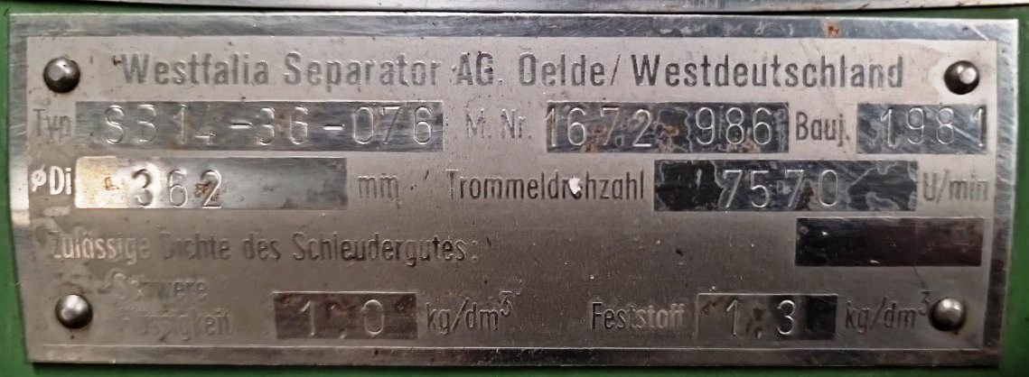 The Westfalia SB 14-36-076 wine clarifier centrifuge, 316SS. is engineered for high-efficiency separation processes, making it an ideal choice for wineries seeking to enhance their production quality. With a maximum bowl speed of 7570 RPM and a force of 11,600 x G, this centrifuge is capable of processing up to 4000 liters per hour, ensuring that your wine is clarified quickly and effectively. The self-thinking design of the centrifuge optimizes operational efficiency by automatically adjusting to varying input conditions, thus providing consistent performance. The robust 7.5 KW motor operates at 380/3/50/1450 RPM, delivering the necessary power to maintain optimal separation under demanding conditions. This makes the Westfalia SB 14-36-076 an indispensable asset for any winery looking to streamline their production process while maintaining the highest quality standards in their wine products.