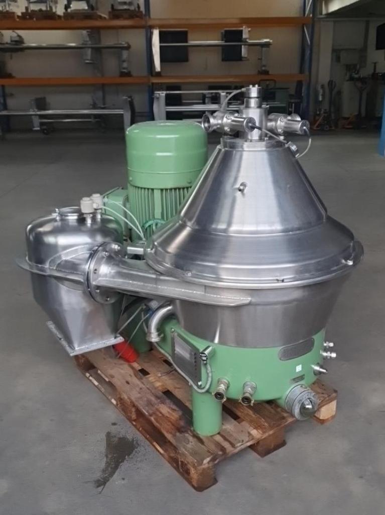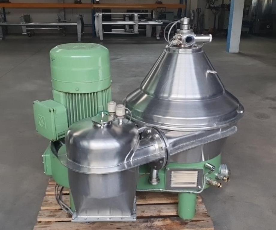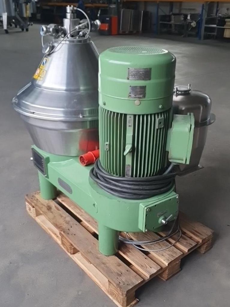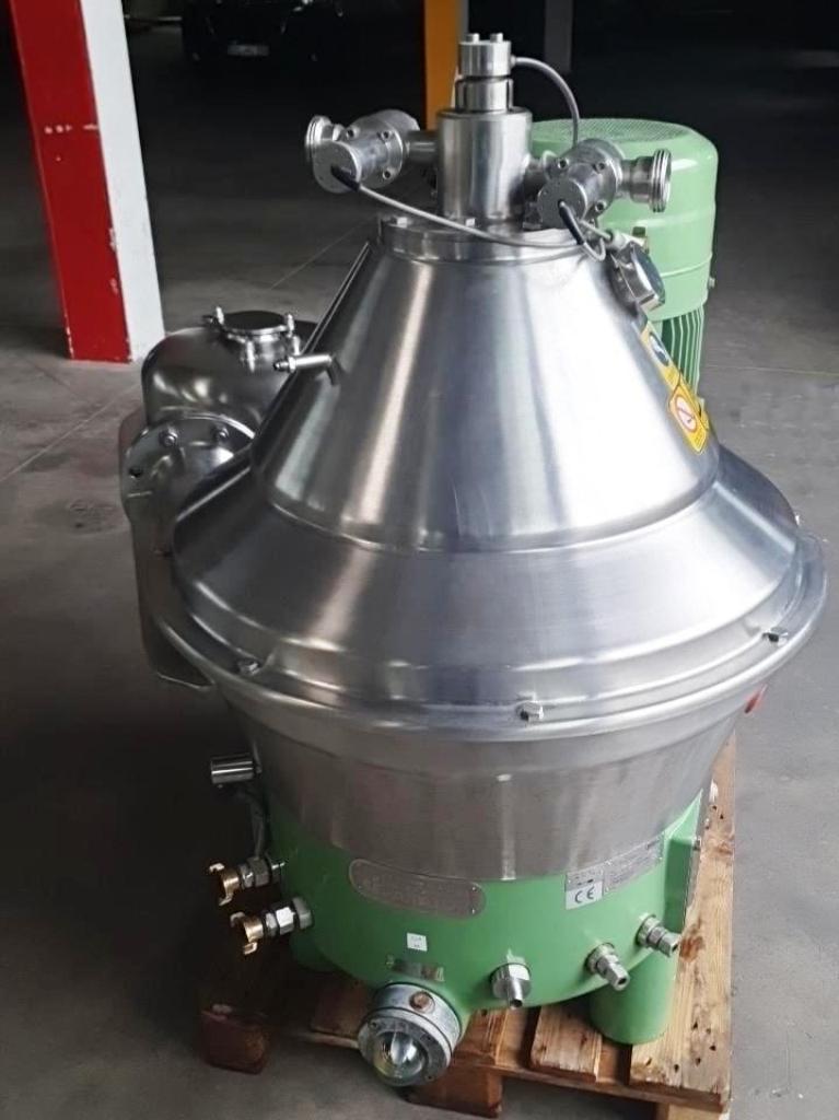 The Westfalia SC 35-06-177 Hydrostop clarifier centrifuge, 316SS. is engineered for high-performance separation processes, making it an ideal choice for industries such as food and beverage, pharmaceuticals, and chemical manufacturing. With a maximum bowl speed of 7270 RPM, this centrifuge is capable of achieving a rated throughput of 11,000 liters per hour (LPH) while efficiently handling up to 11 liters of solids. The robust 18.5 kW motor, operating at 380V, 3-phase, and 50 Hz, ensures reliable performance, even under continuous operation. The inclusion of a flow meter, solids pump, and solids cyclone enhances the operational efficiency, allowing for precise control over the separation process and ensuring optimal product quality.