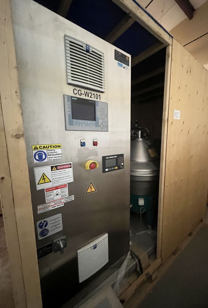 Max bowl speed 7230 RPM, rated @ 11,000 LPH, 11L solids capacity. 18.5 KW motor 380/3/50/2970 RPM, flow meter, valves, sludge cyclone, brush strainer, PLC control panel, vibration isolators and tools. Reconditioned.