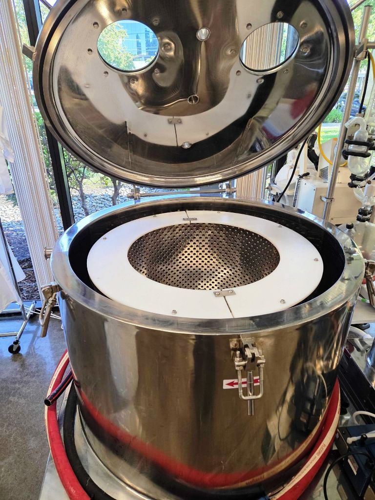 Max speed 1200 RPM, 645 x G, 800 x 400mm (31.5 x 15.75") perforate removable basket ID, volume 100 L, max load 135 kg, filtration area 1 sqM. cGMP/FDA pharma grade, vapor-tight, pneumatic flip-top design, biomass washed per run 150 lbs, temp -40C - 80C. 5.5 KW XP motor 460/3/60/1750 RPM, sight glasses, tri-clamp feed port and drain, pressure gauge, brake, vibration isolators, mounted on a skid and control panel. 2022 vintage. Excellent condition.